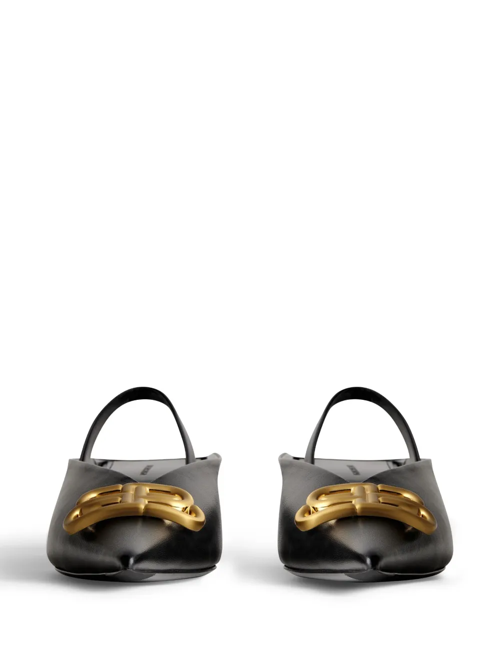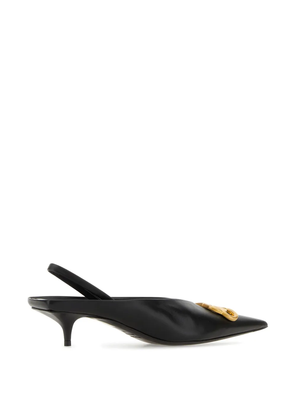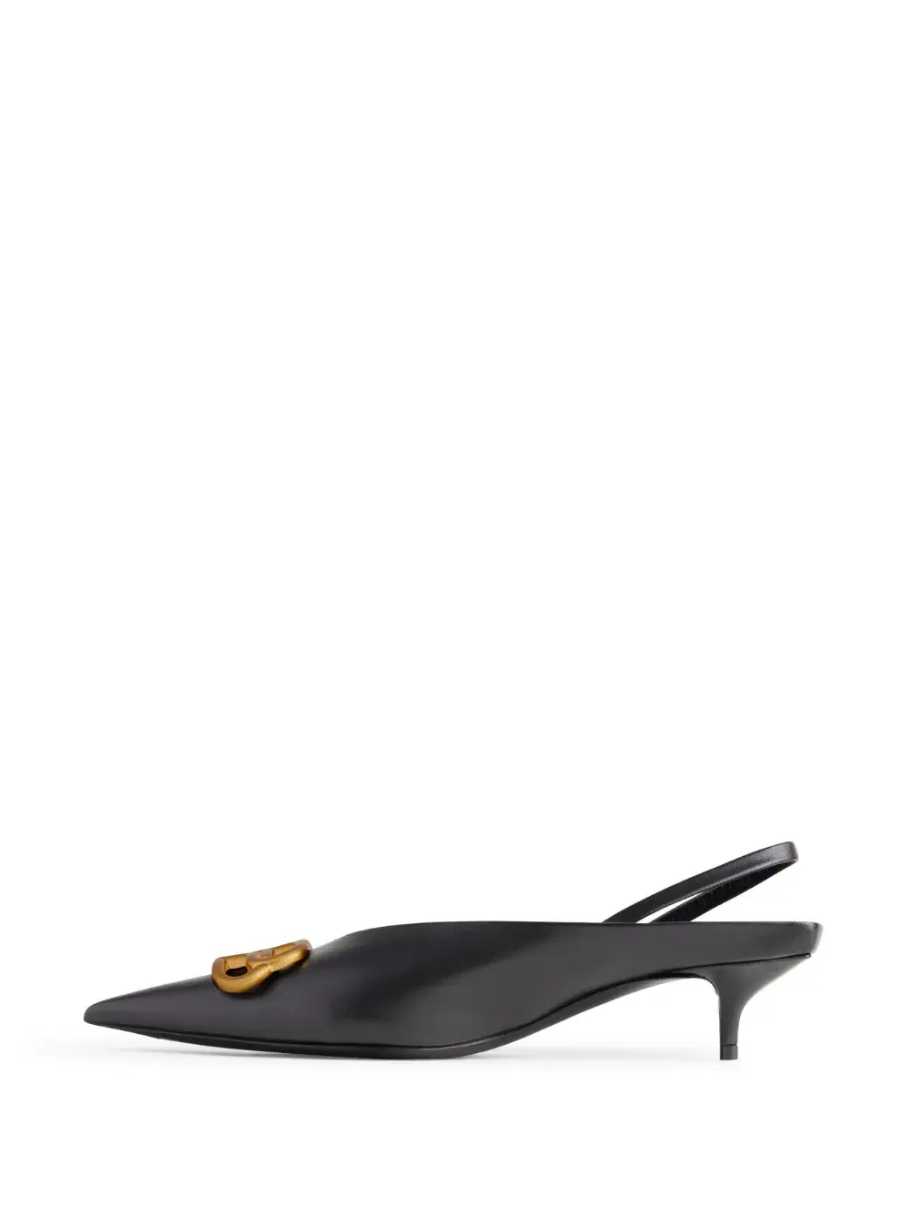 Черный, телячья кожа, золотистый металлический логотип, заостренный носок, ремешок на пятке, стелька с логотипом и каблук-рюмка.