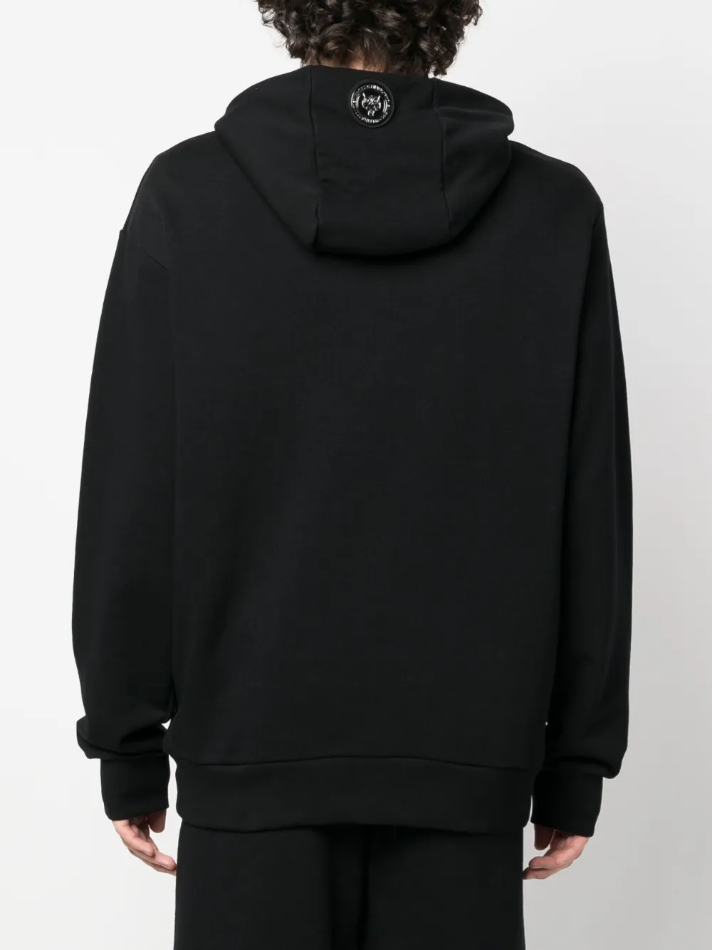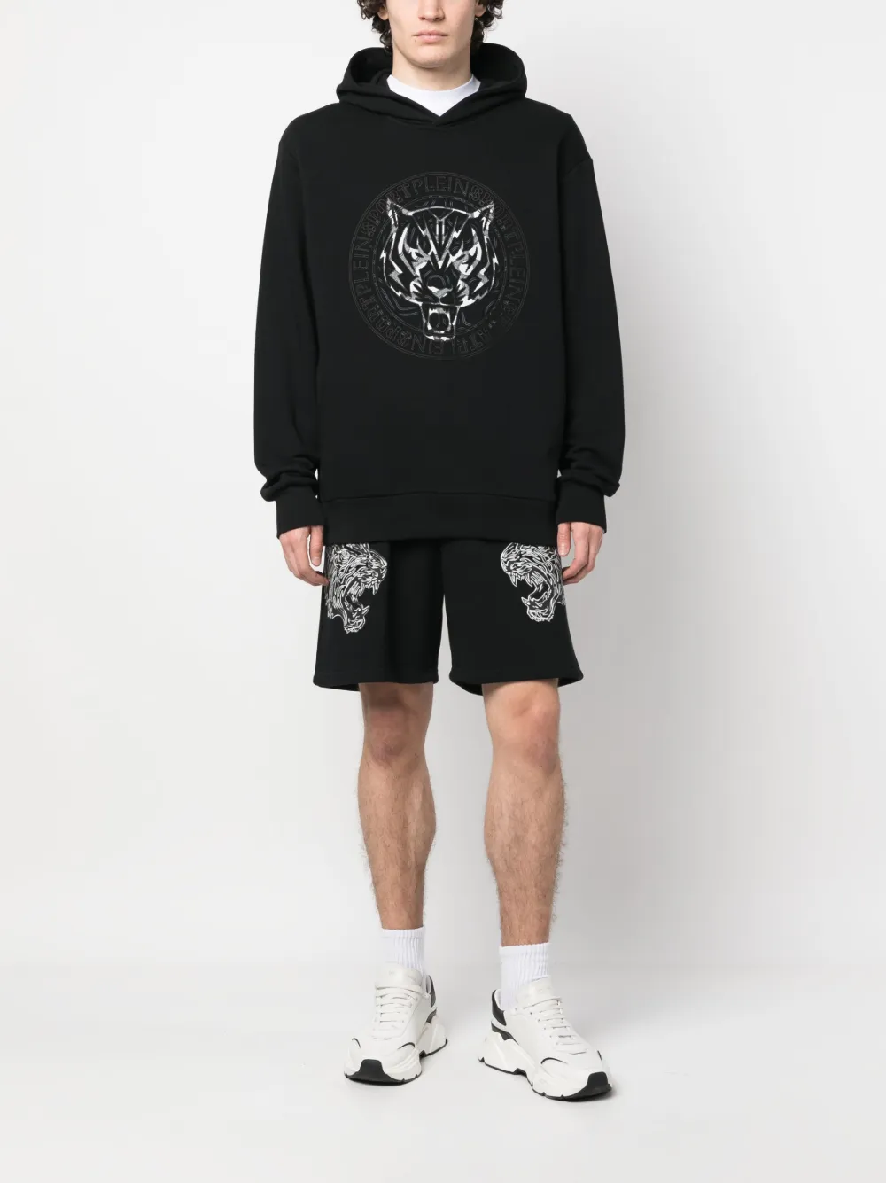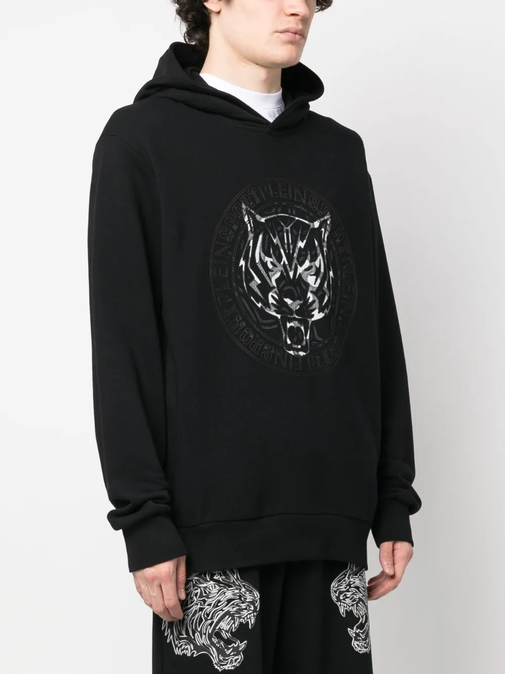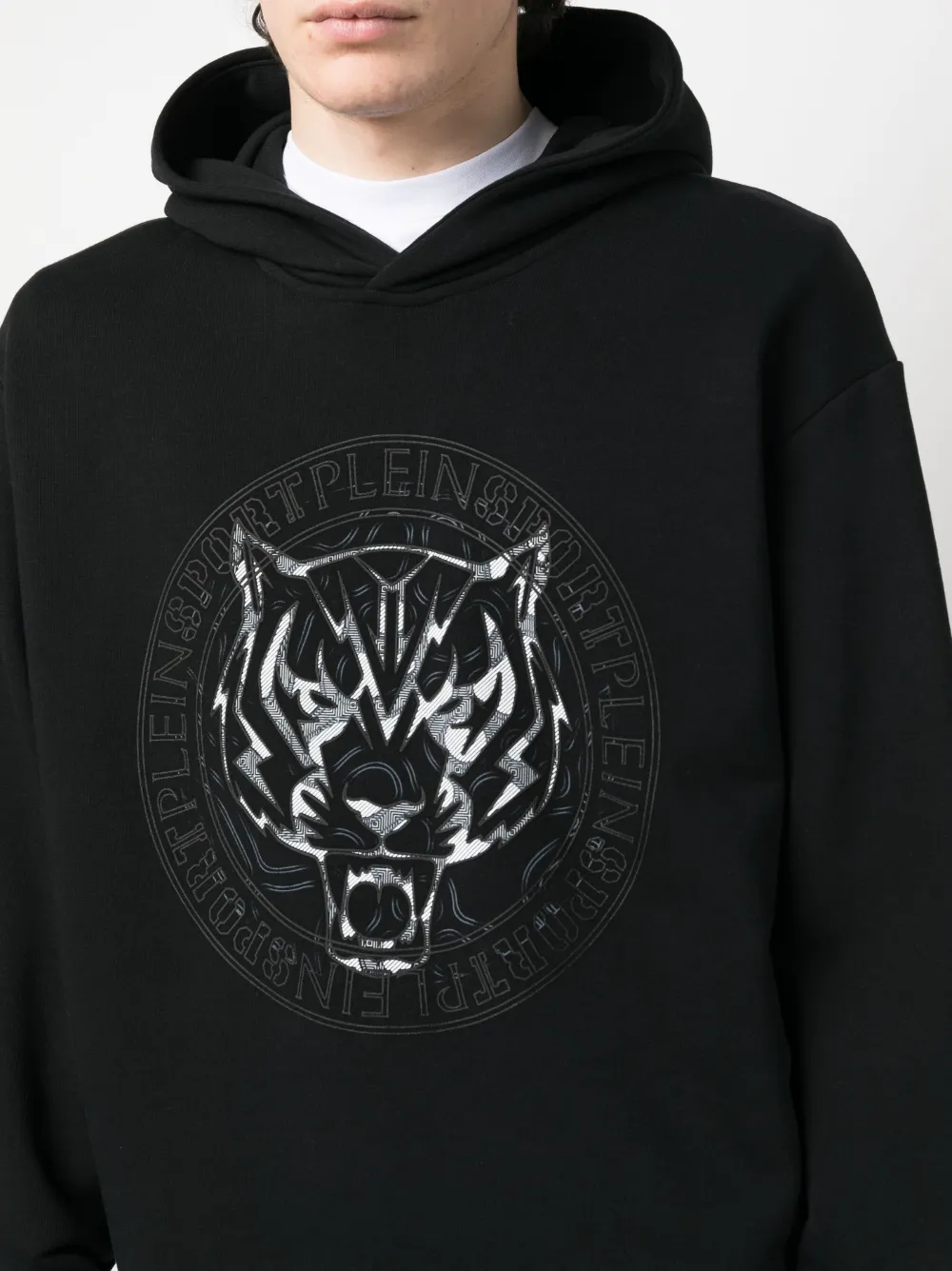 Черный, принт с изображением тигра, объемный капюшон, карман-муфта, длинные рукава и прямой подол