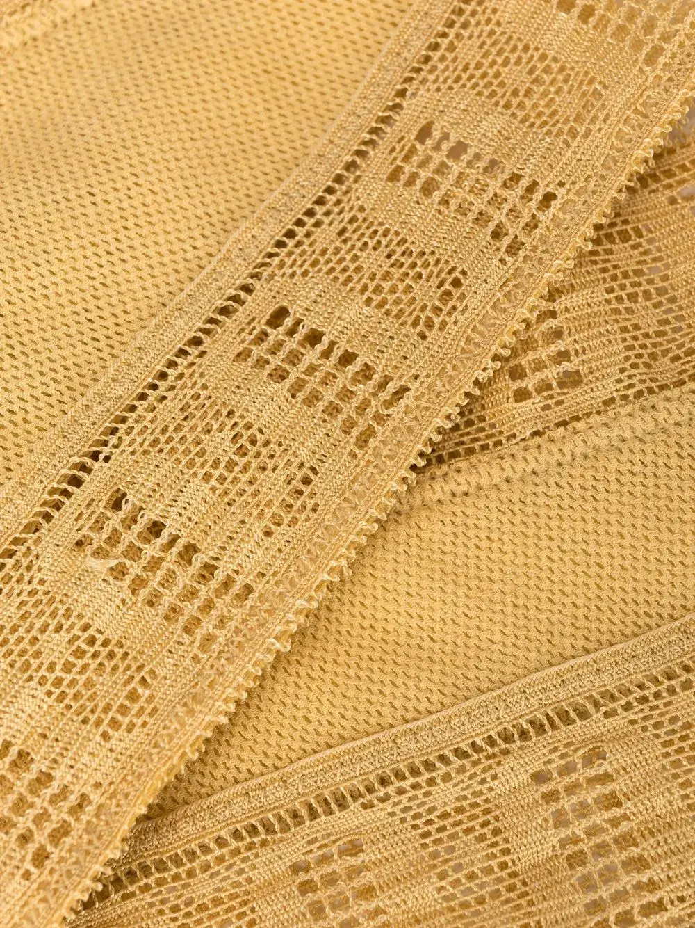 Желтый, смесовый хлопок, эластичный материал, кружевная отделка и трусы-танга, эту вещь можно примерить, но только поверх собственного белья
