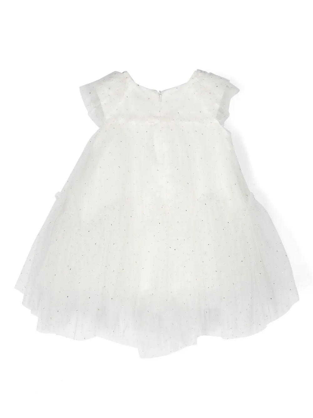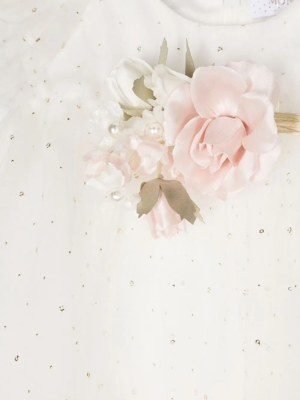 Белый, хлопок, верхний слой из тюля, украшения из горного хрусталя, декор в виде искусственного цветка, круглый вырез, рукава кап и ярусная юбка