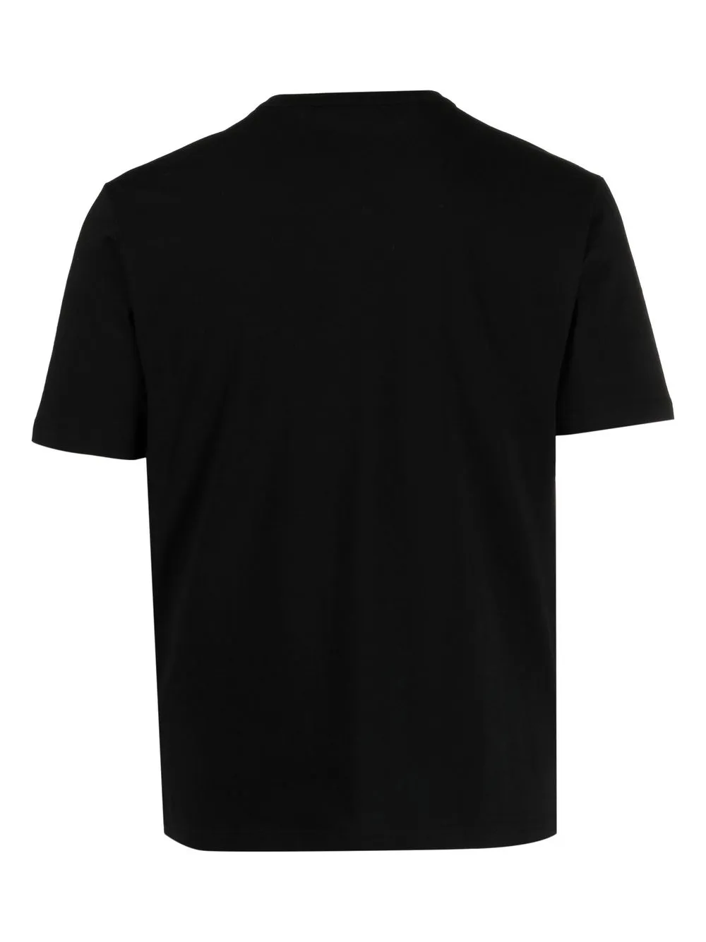 Черный, эластичный хлопок, маленькая подвеска с логотипом, круглый вырез, короткие рукава и прямой подол.