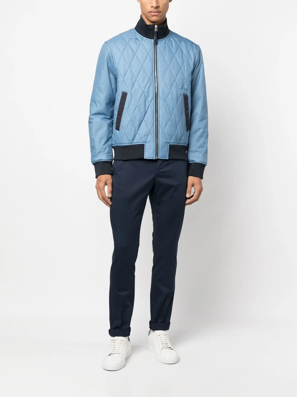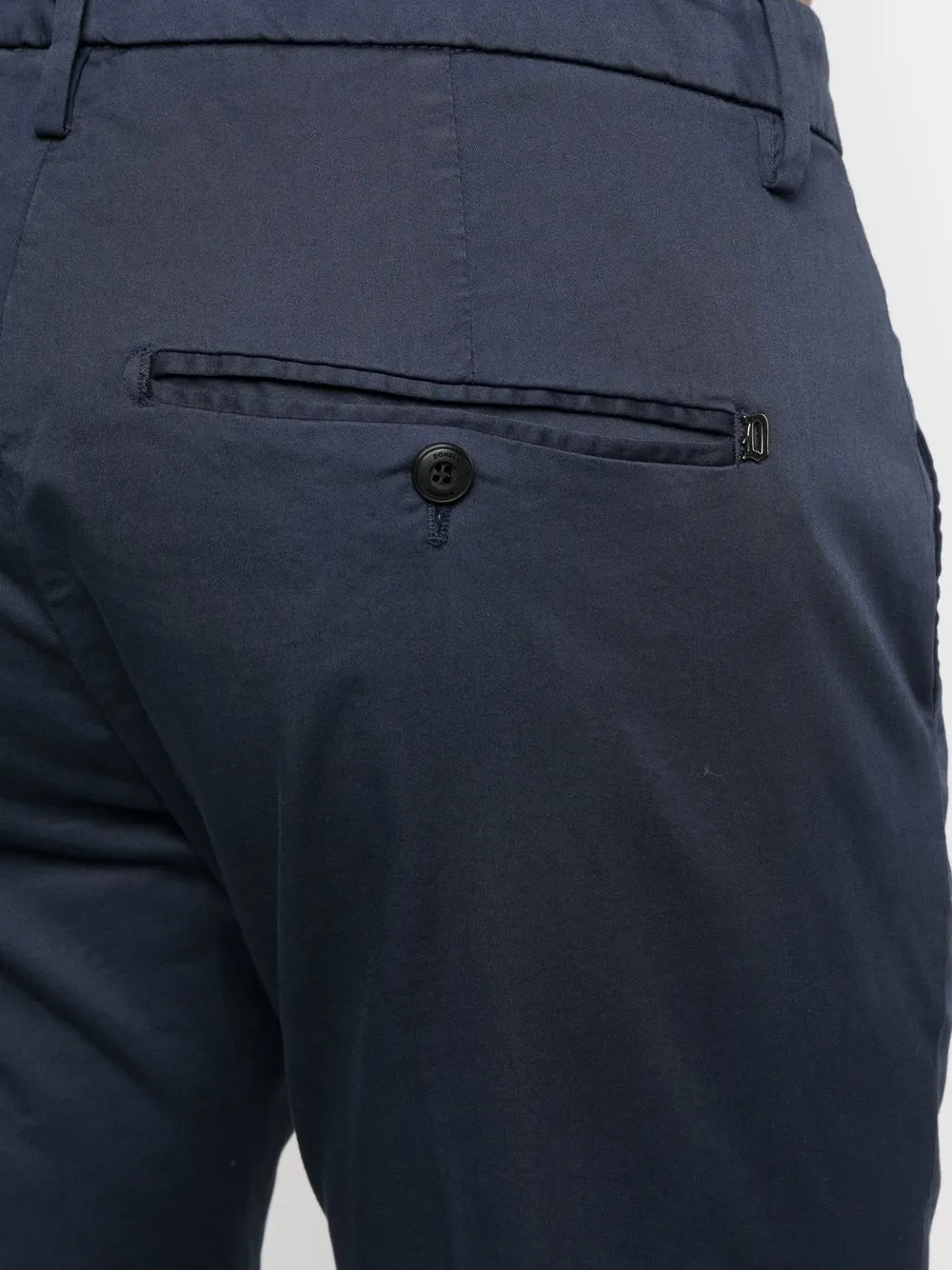 Синий, хлопок, застежка на молнии и пуговице спереди, петли для ремня, два прорезных кармана по бокам, два кармана с листочкой сзади, узкий крой и подвернутые манжеты