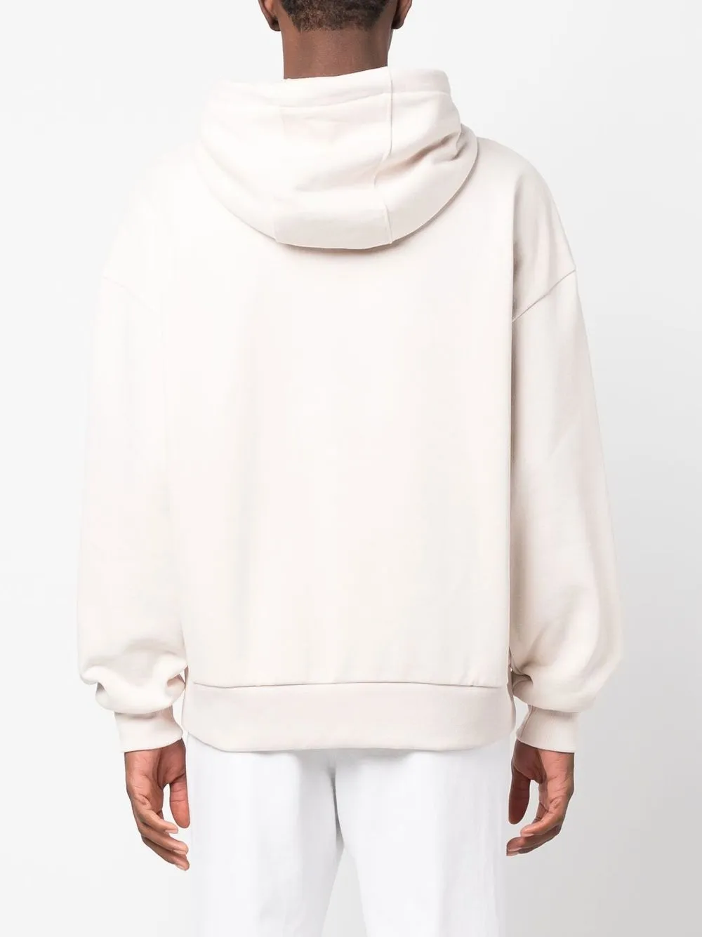 Белый, смесовый хлопок, тисненый логотип спереди, затягивающийся на шнурок капюшон, приспущенные плечи, длинные рукава, манжеты в рубчик, подол в рубчик и флисовая подкладка