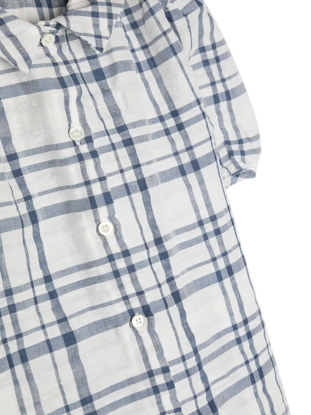 Синий/белый, лен, смесовый хлопок, принт в шотландскую клетку, сирсакер, классический воротник, короткие объемные рукава, застежка на пуговицах спереди и прямой подол.