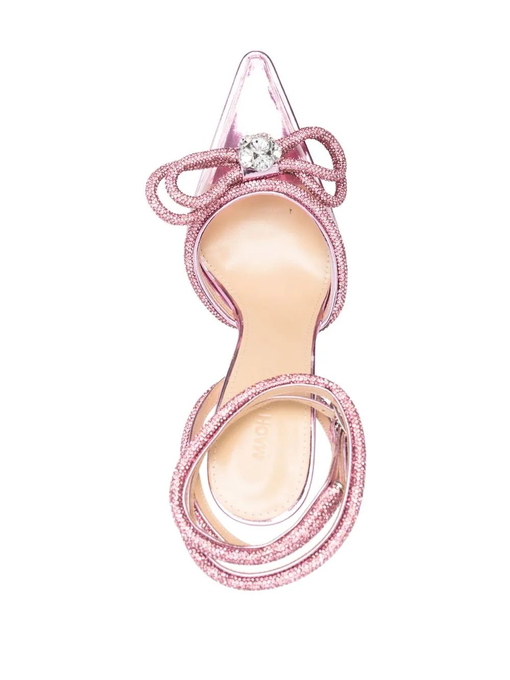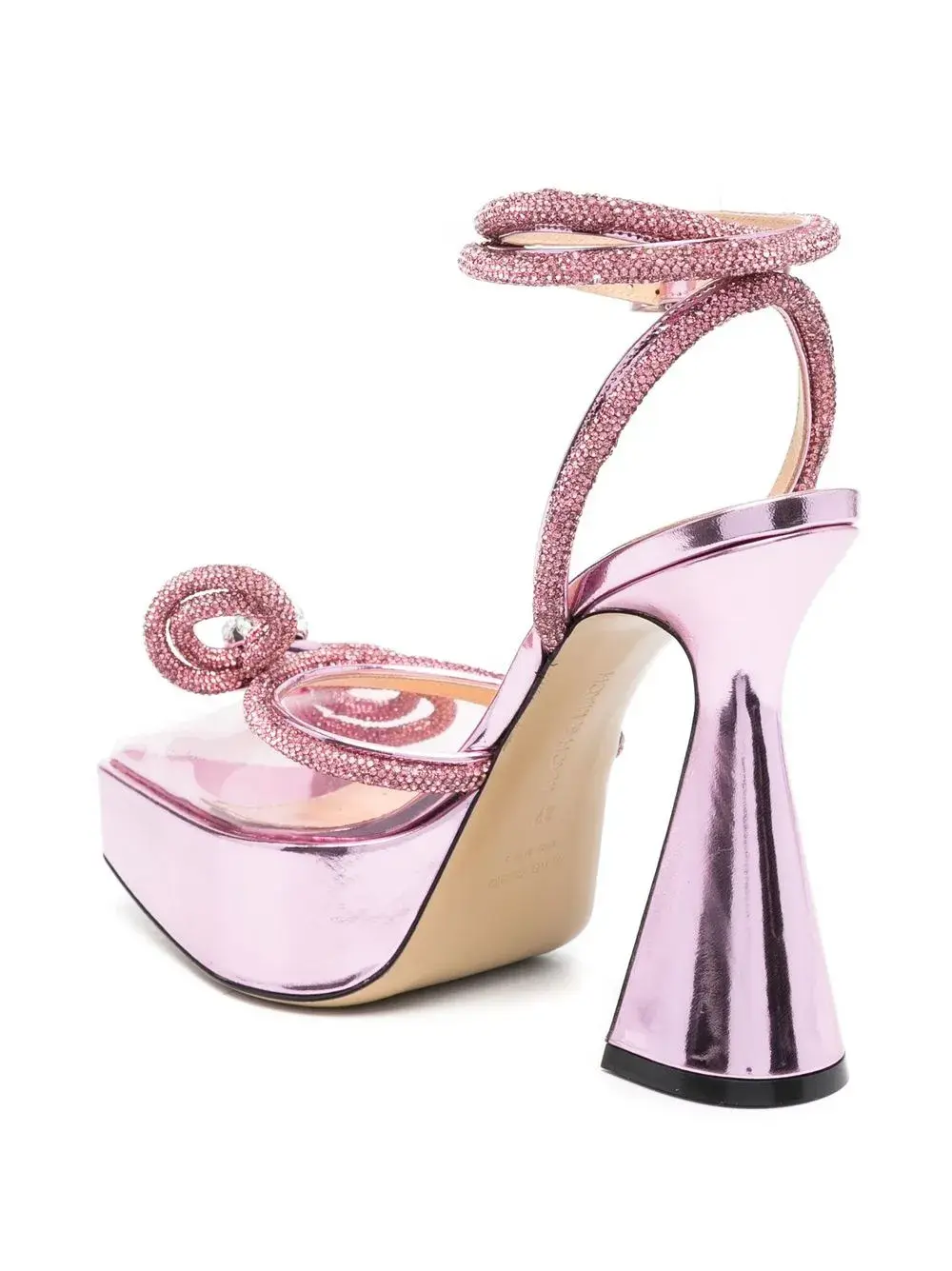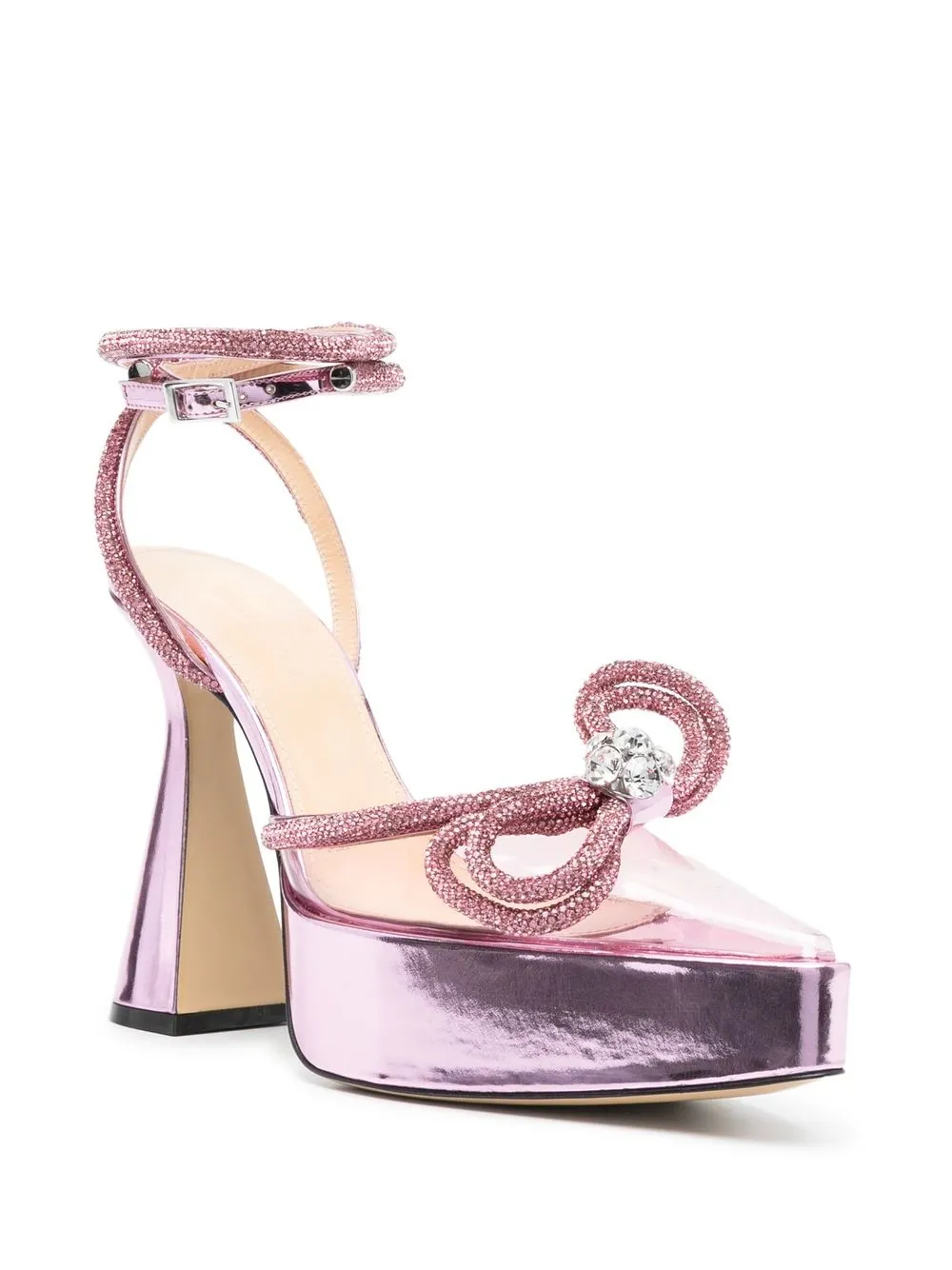 Розовый, телячья кожа, покрытие с эффектом металлик, декор из кристаллов, бант, заостренный носок, подошва на платформе, ремешок на щиколотке с пряжкой и высокий блочный каблук