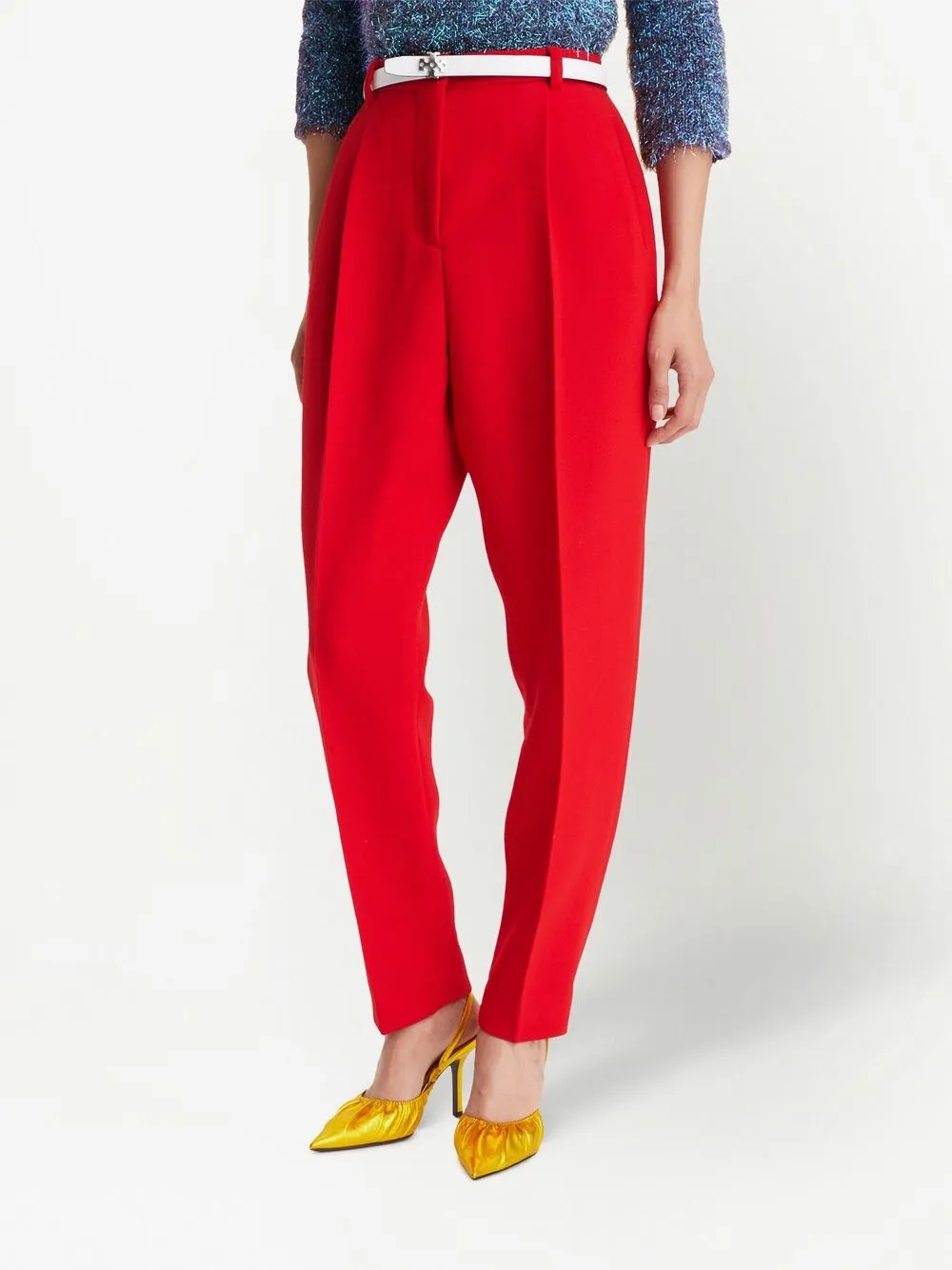 Ярко-красный, шерсть, складки, завышенная талия, зауженный крой, прорезные карманы по бокам и ремень на талии