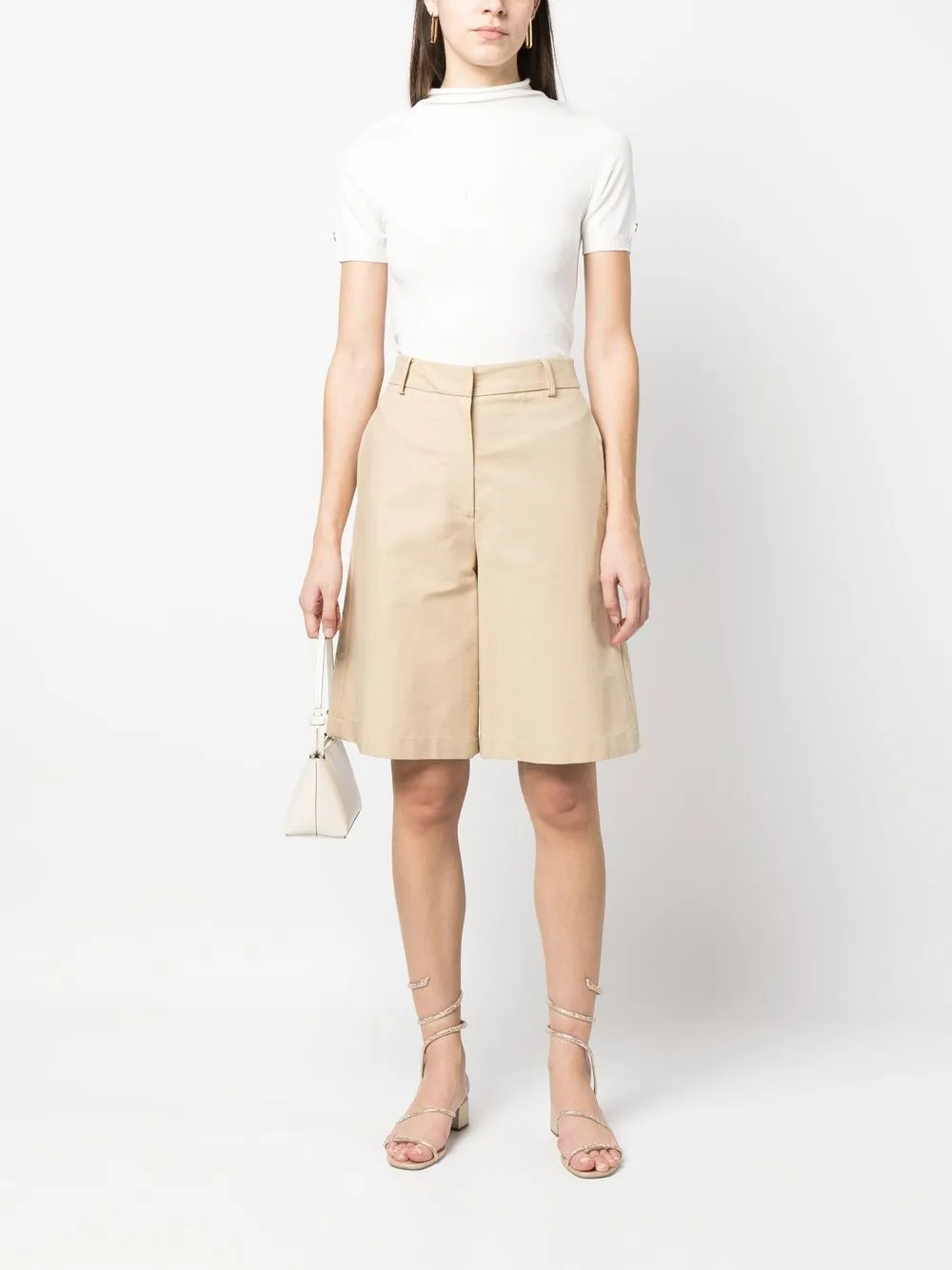 Расцветка Cloud White, тонкая вязка, вязаные края в рубчик, золотистый металлический логотип, высокий воротник, короткие рукава и прямой подол