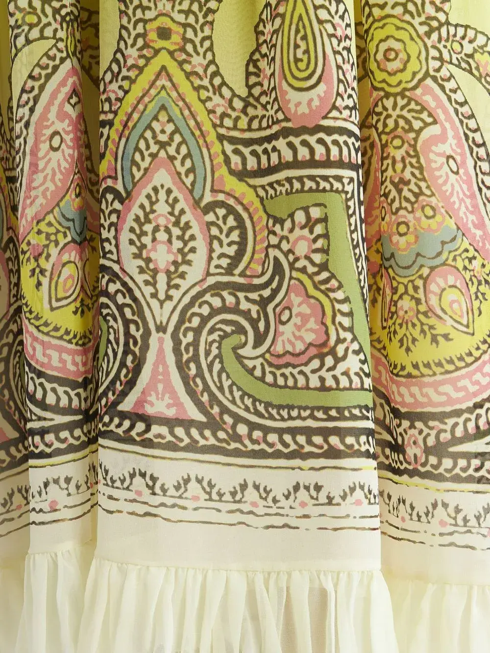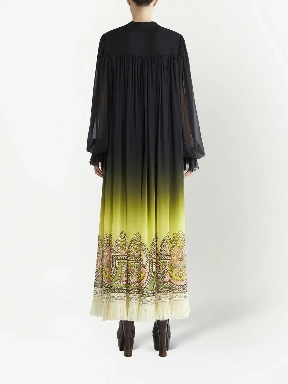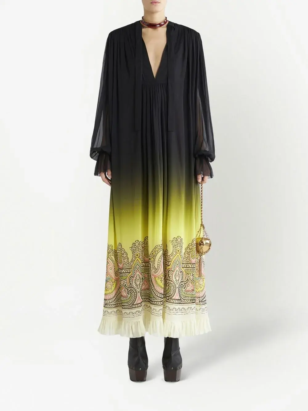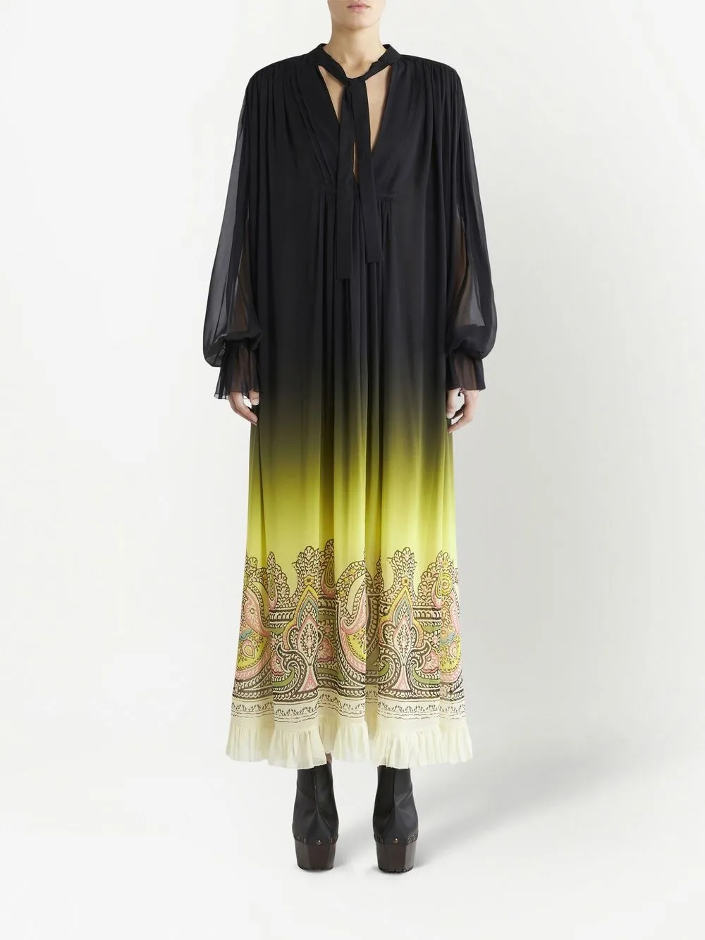 Черный, салатовый, шелк, принт пейсли, градиентный эффект, завязки спереди, объемные рукава, силуэт трапеция и высота по щиколотку