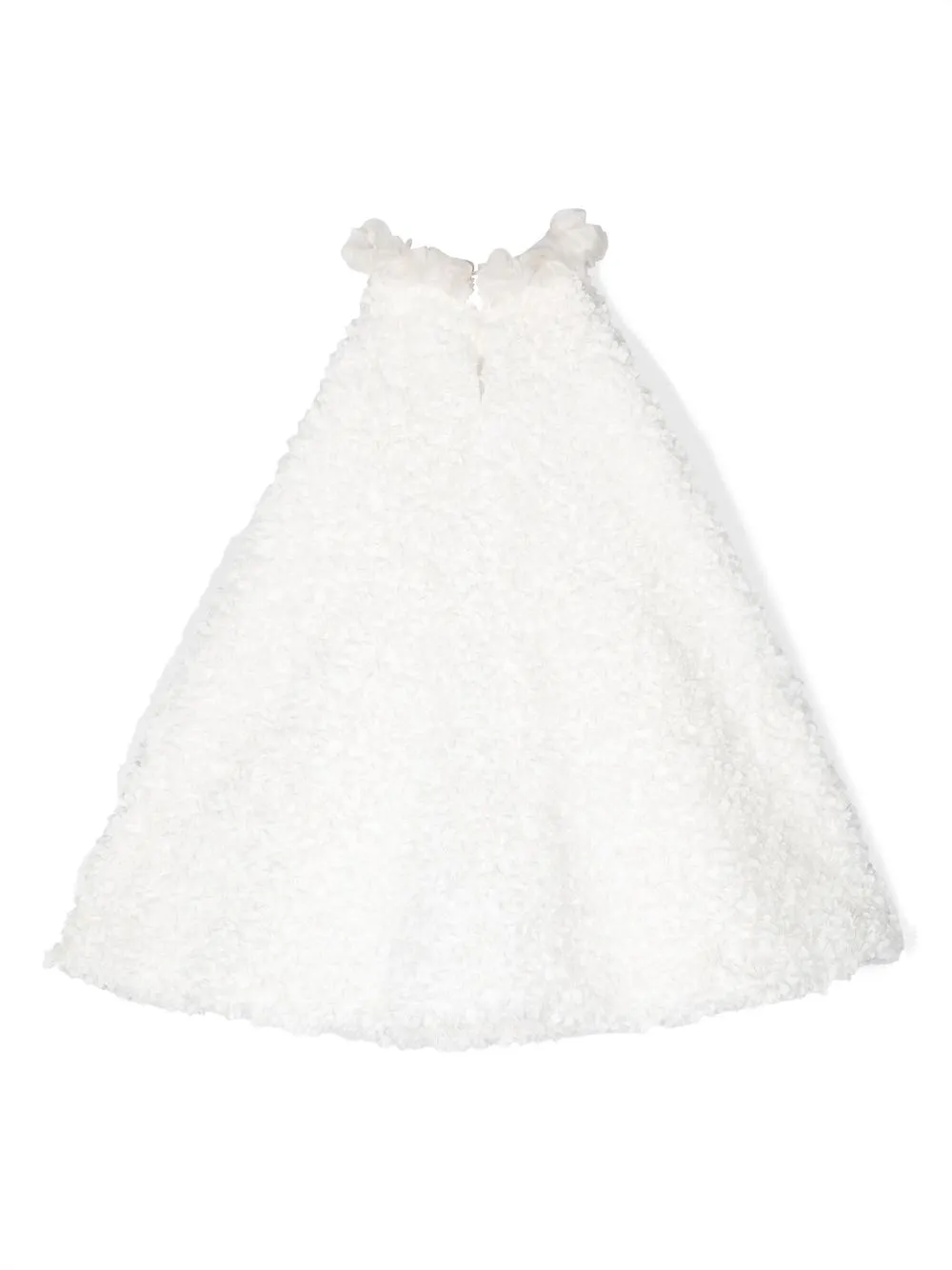 Белый, хлопок, аппликация, органза, цветочная деталь, круглый вырез, потайная застежка сзади, без рукавов и расклешенный крой