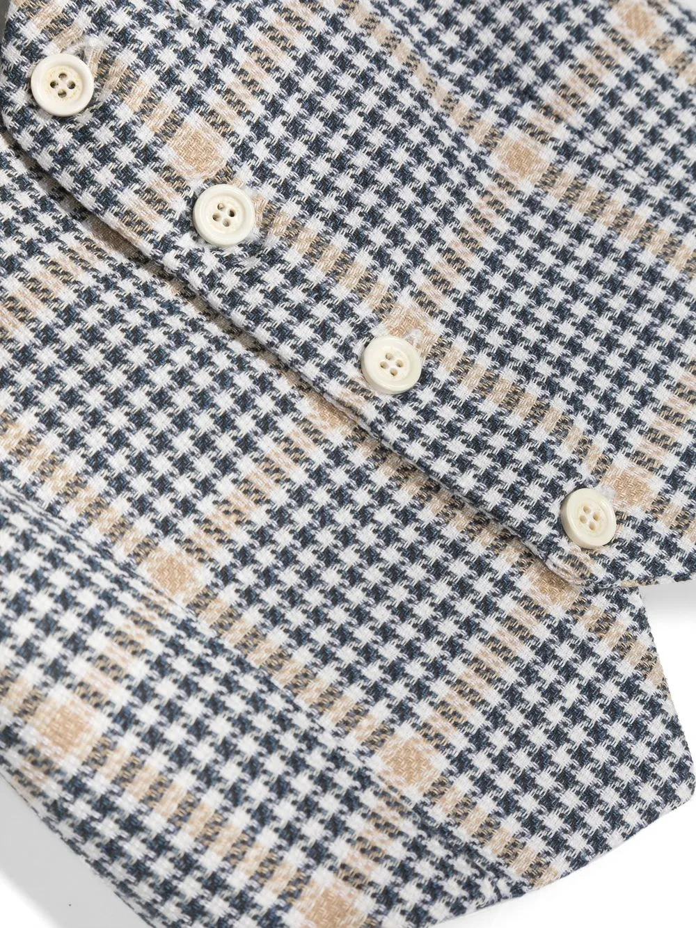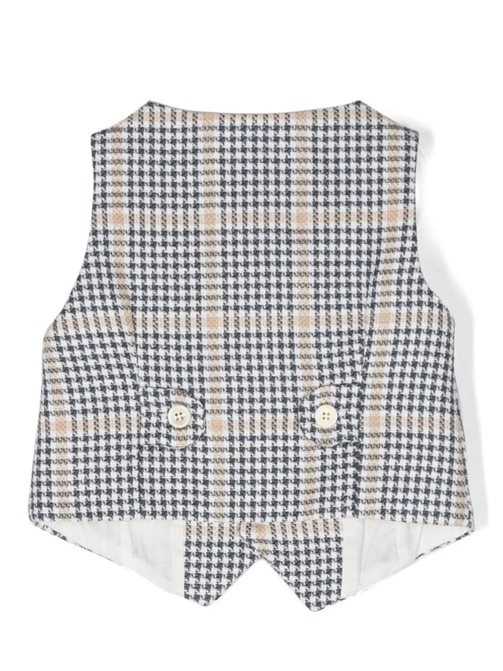 Темно-синий, белый, бежевый, смесовый хлопок, клетчатый узор, узор в ломаную клетку, V-образный вырез, застежка на пуговицах спереди и без рукавов
