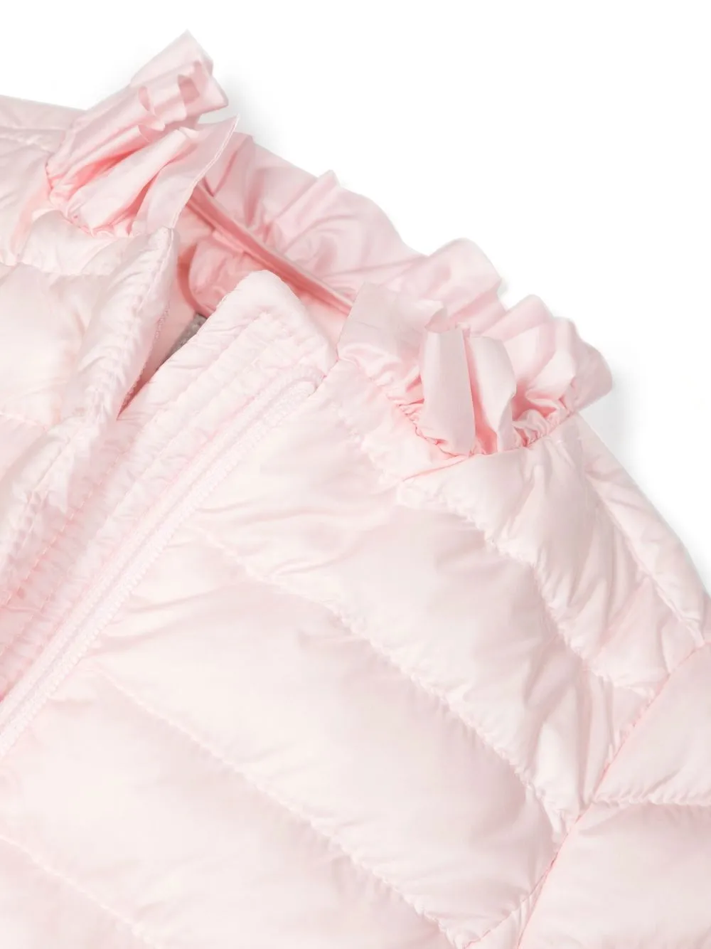 Светло-розовый, наполнитель из пуха и перьев, дутый материал, нашивка с логотипом на рукаве, застежка на молнии спереди и длинные рукава