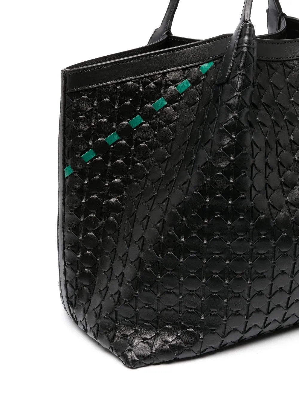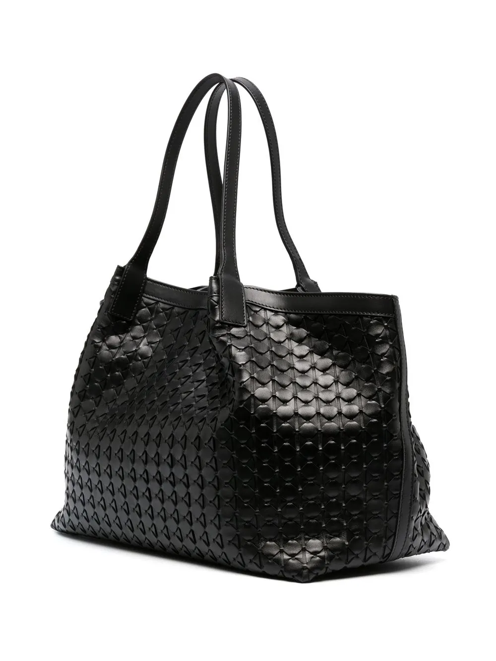 Черный, телячья кожа, фактурная отделка, логотип спереди, две плоские верхние ручки и потайная застежка на кнопках