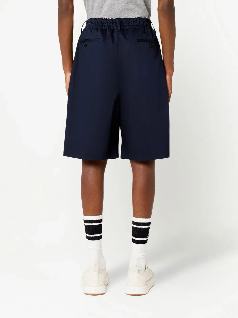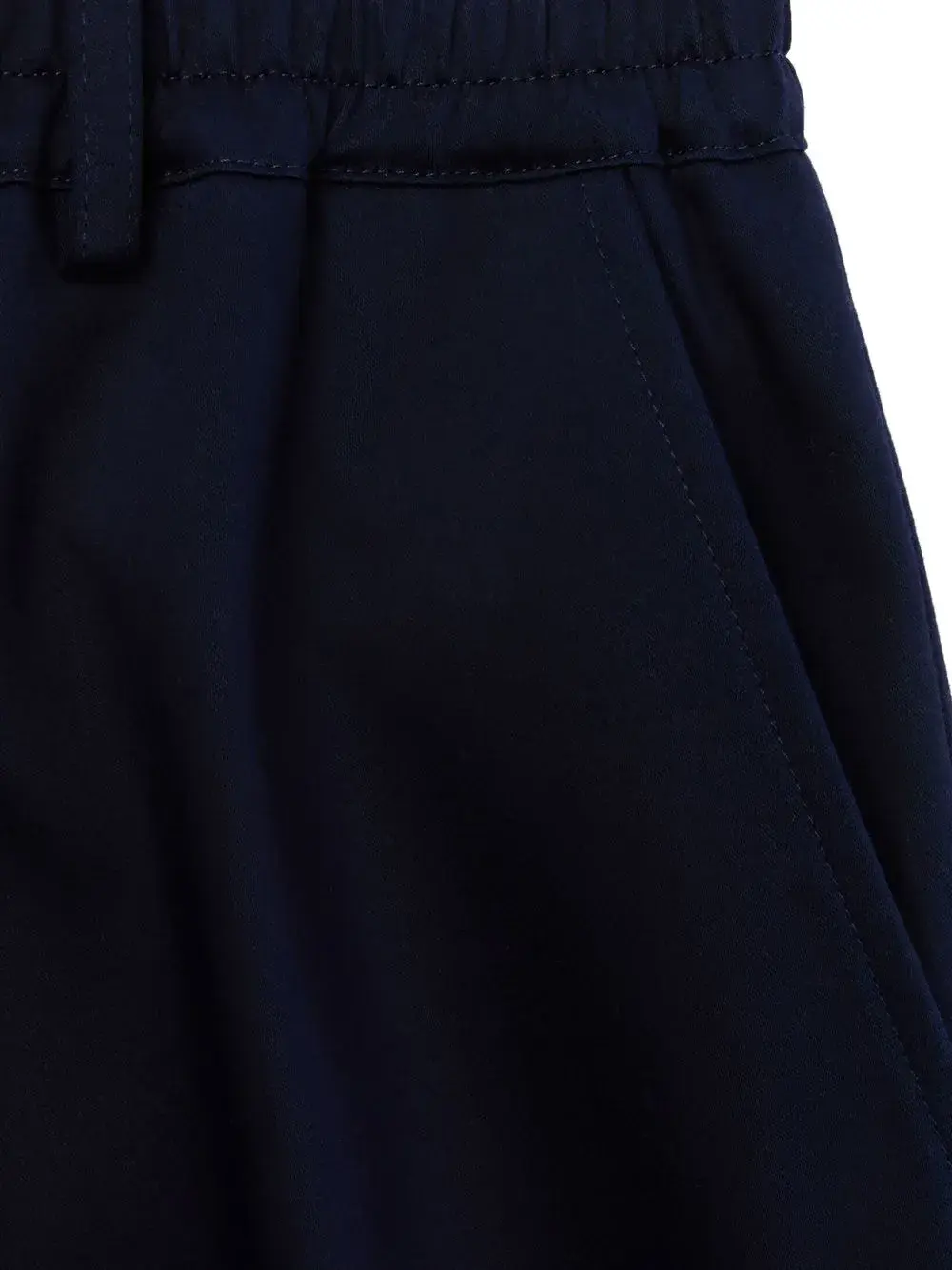 Темно-синий, хлопок, эластичный пояс, петли для ремня, оправа оверсайз, длина ниже колена, два прорезных кармана по бокам и два кармана на пуговице сзади.