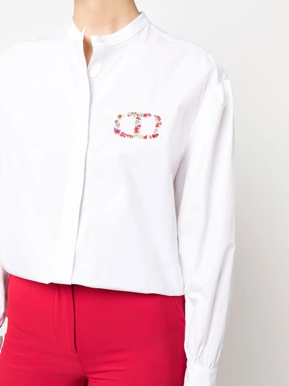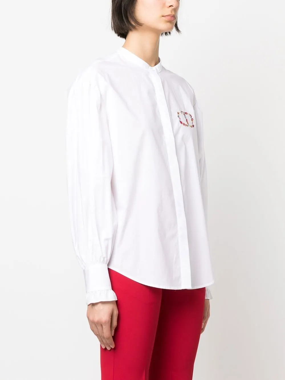 Белый, хлопок, без воротника, вышитый логотип на груди, без воротника, потайная пуговичная застежка спереди, длинные рукава, отделка с оборками и детали с оборками
