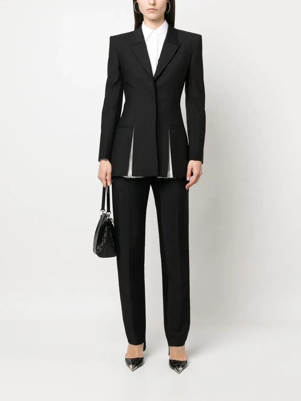 Черный, смесь шерсти и мохера, потайная застежка спереди, зазубренные лацканы, два передних кармана с листочкой, разрез спереди, подплечники, длинные рукава и шлица по центру сзади