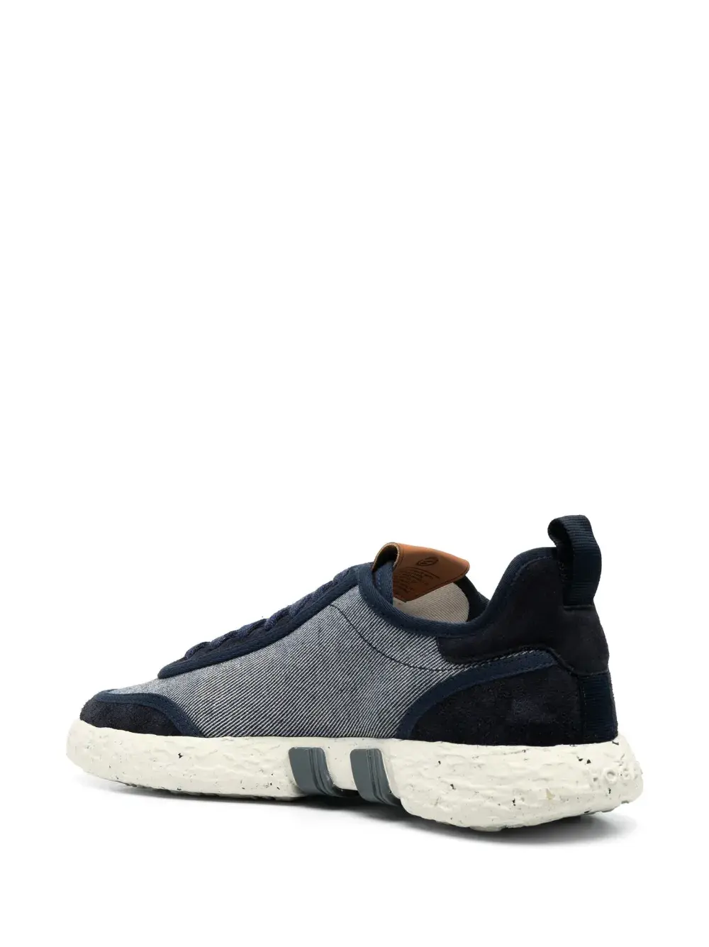 Темно-синий, белый, парусина, замшевые вставки, нашивка с логотипом сбоку, нашивка с логотипом на язычке, закругленный носок, шнуровка спереди, кожаная стелька с логотипом, петля для подтягивания сзади и резиновая подошва