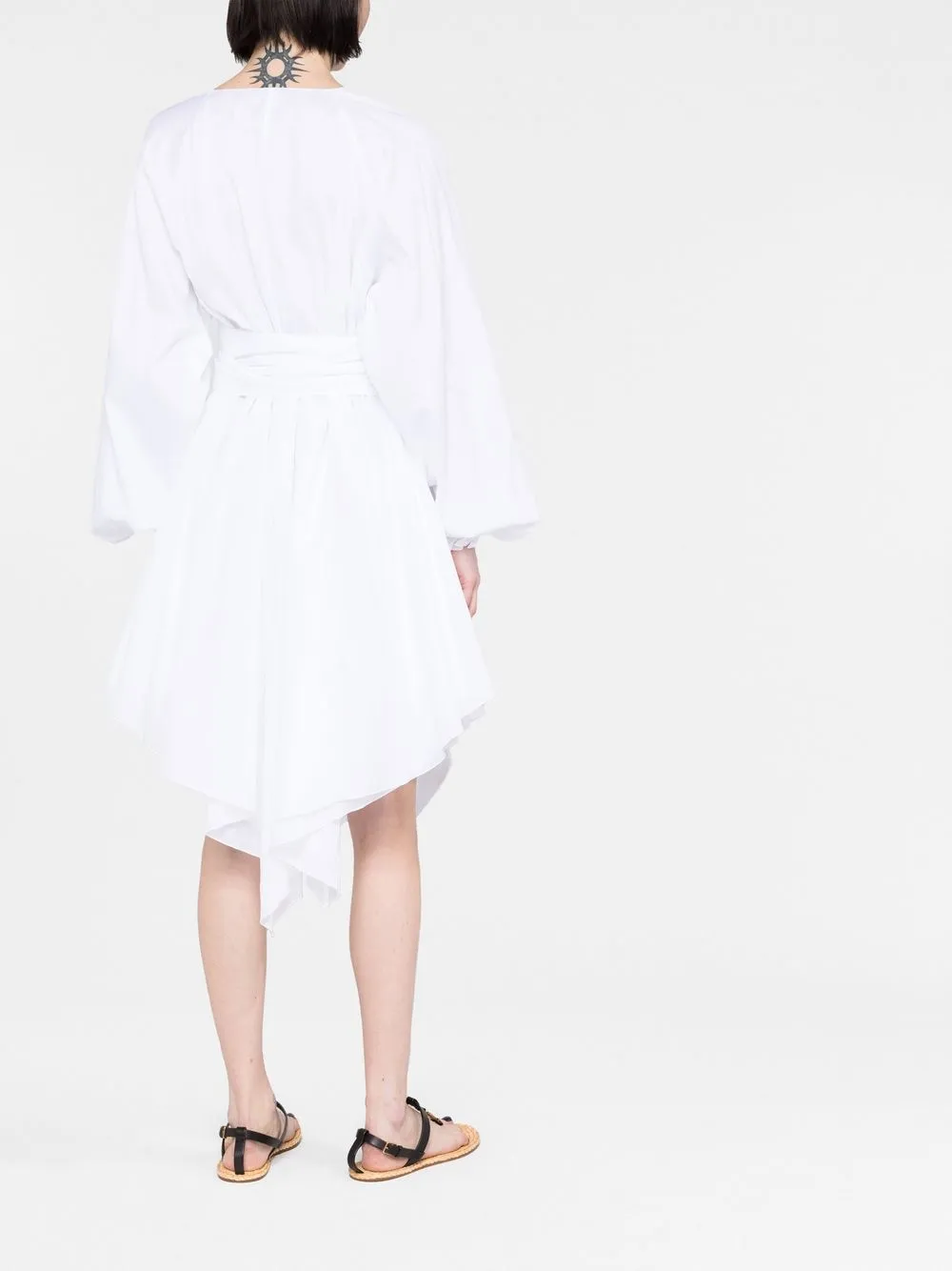 Белый, хлопок, застежка на завязке сзади, детали с оборками, V-образный вырез, длинные рукава и асимметричный подол