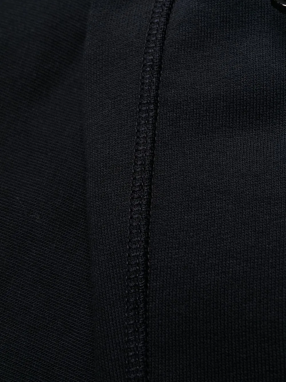 Темно-синий, эластичный хлопок, эластичные манжеты, два кармана на молнии по бокам и карман на молнии сзади