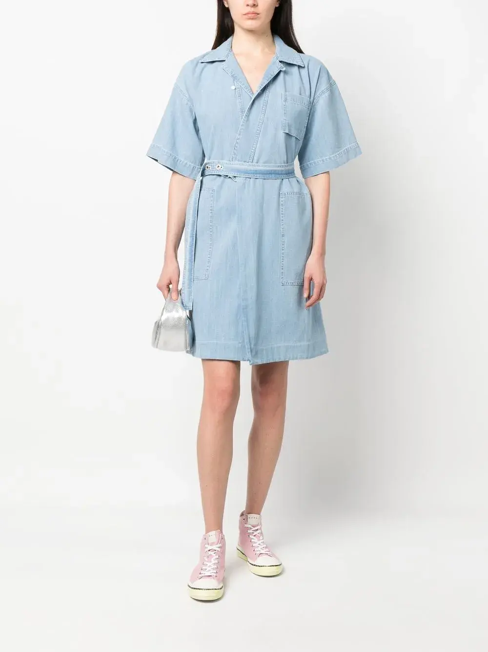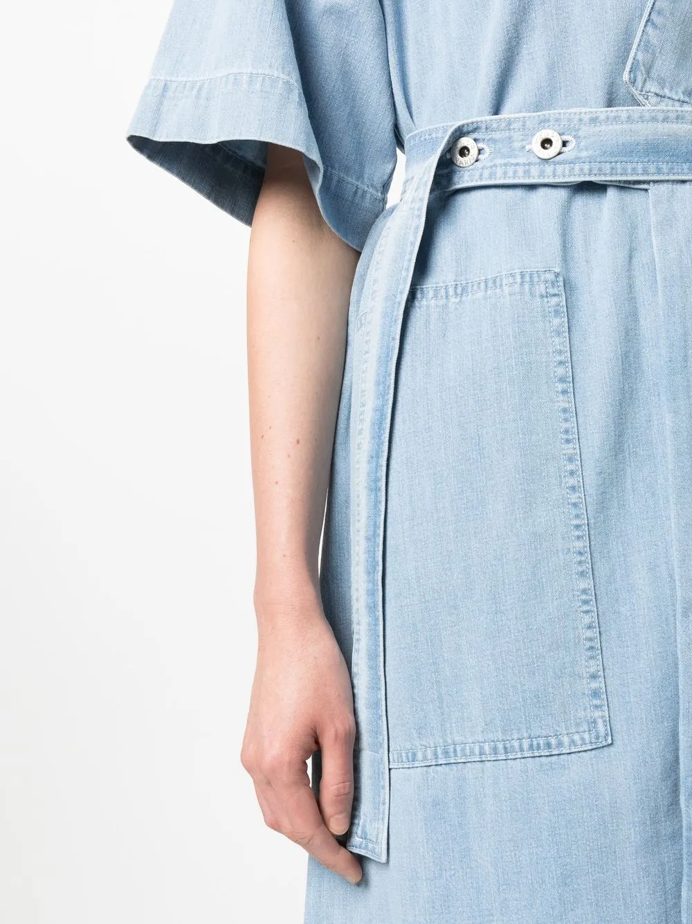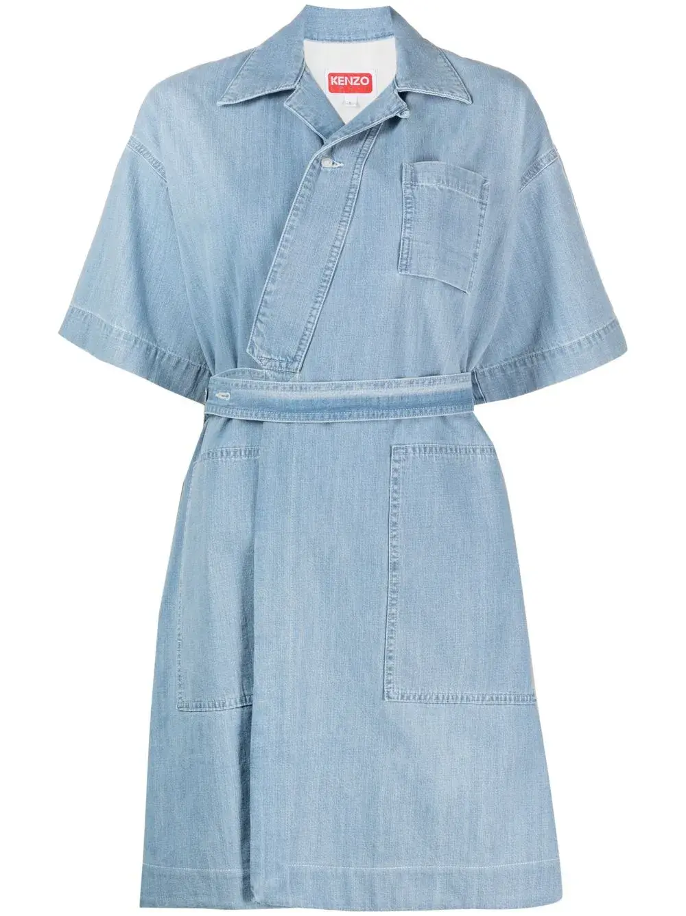 Голубой, хлопок, обработанный деним, классический воротник, короткие рукава, смещенная застежка спереди, кулиска на талии, два накладных кармана спереди и прорезной карман на груди