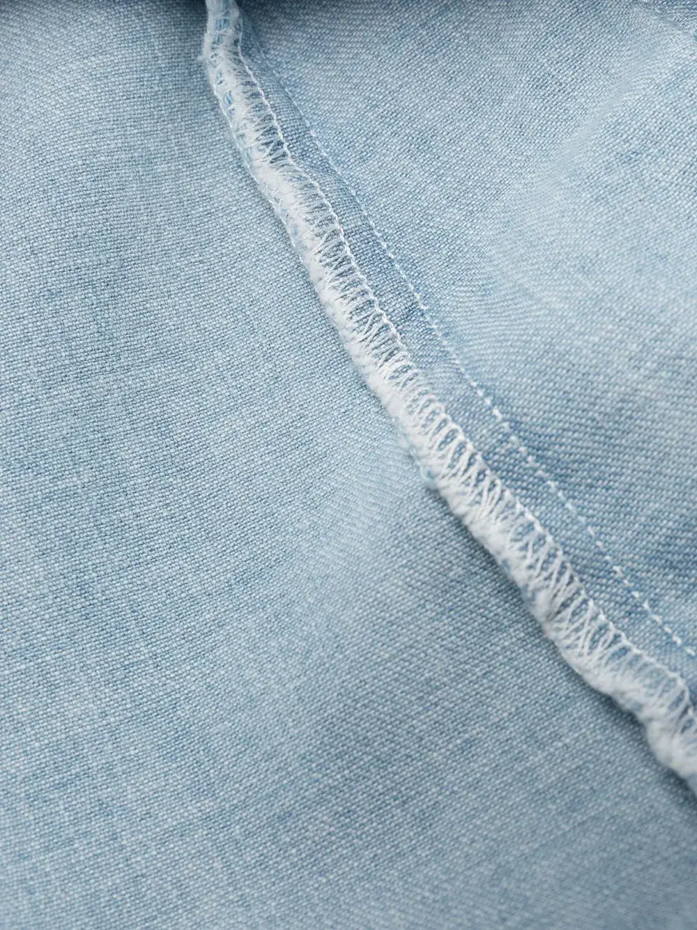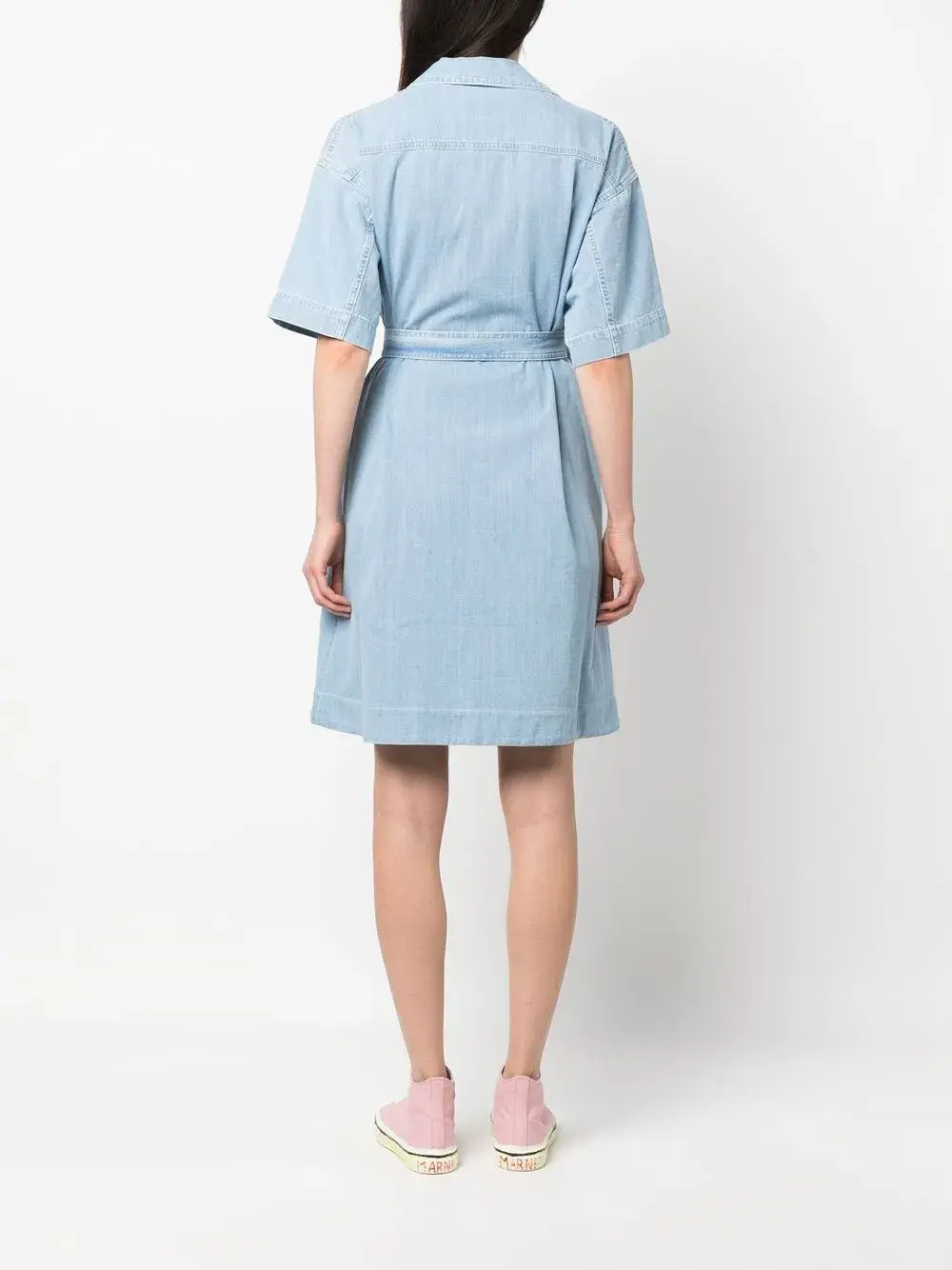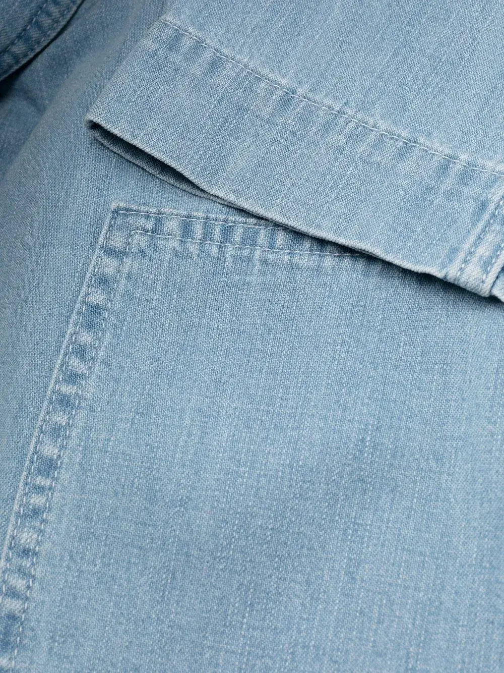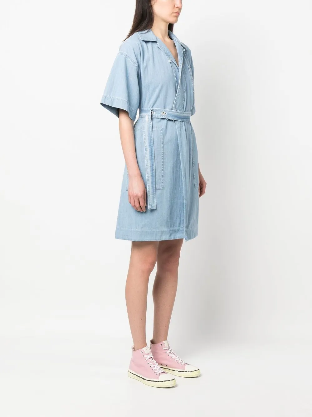 Голубой, хлопок, обработанный деним, классический воротник, короткие рукава, смещенная застежка спереди, кулиска на талии, два накладных кармана спереди и прорезной карман на груди