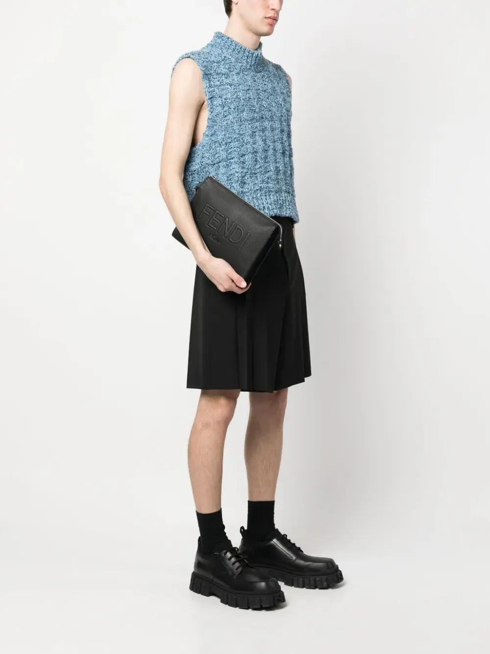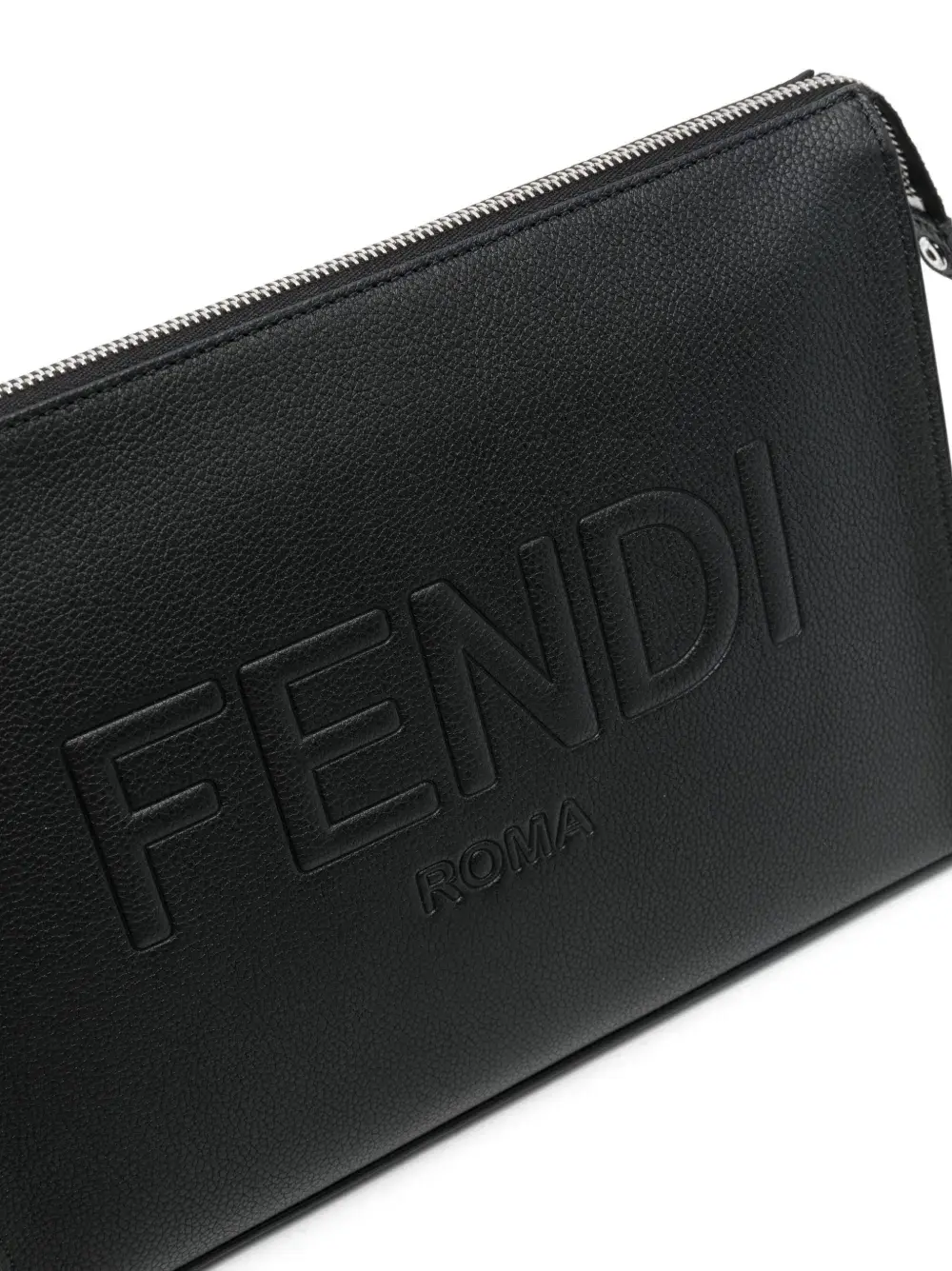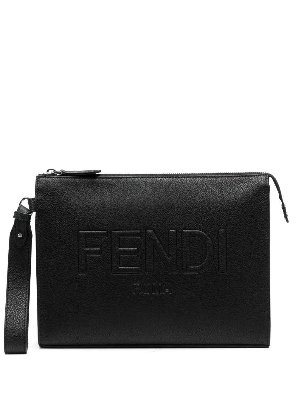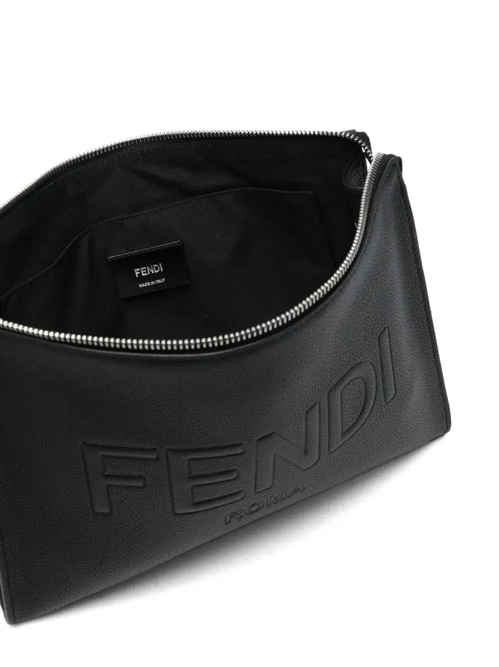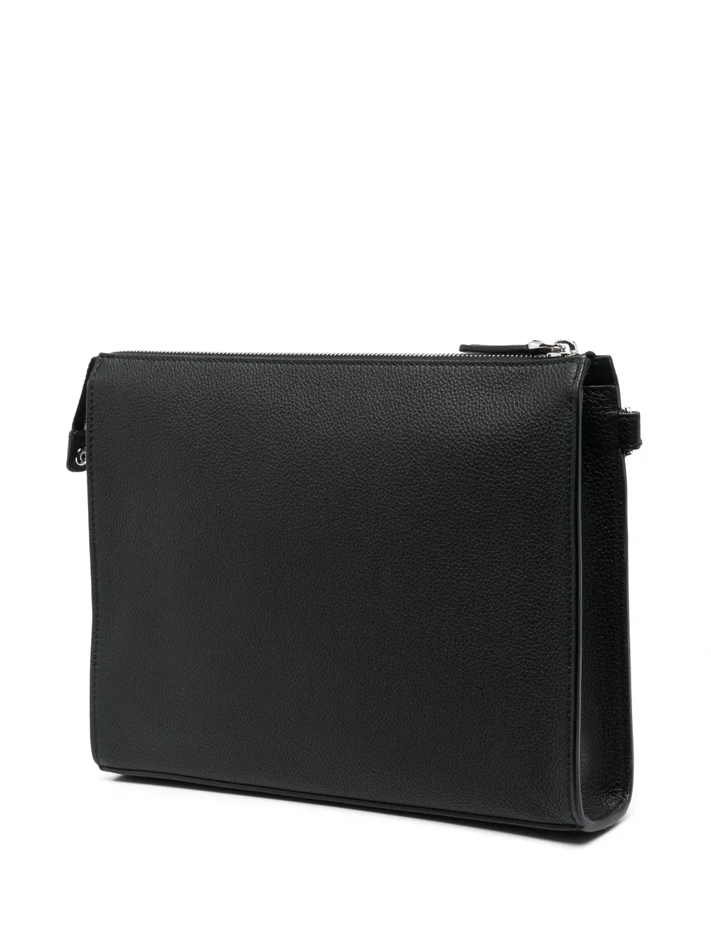 Черный, телячья кожа, зернистая текстура, тисненый логотип спереди, застежка на молнии сверху, ремешок на запястье и основное отделение