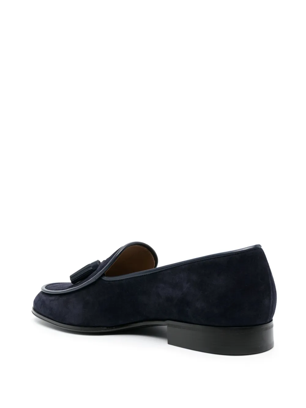 Темно-синий, замша из телячьей кожи, телячья кожа, кожаная стелька с логотипом, декоративные кисточки, миндалевидный носок, модель без застежки и низкий каблук