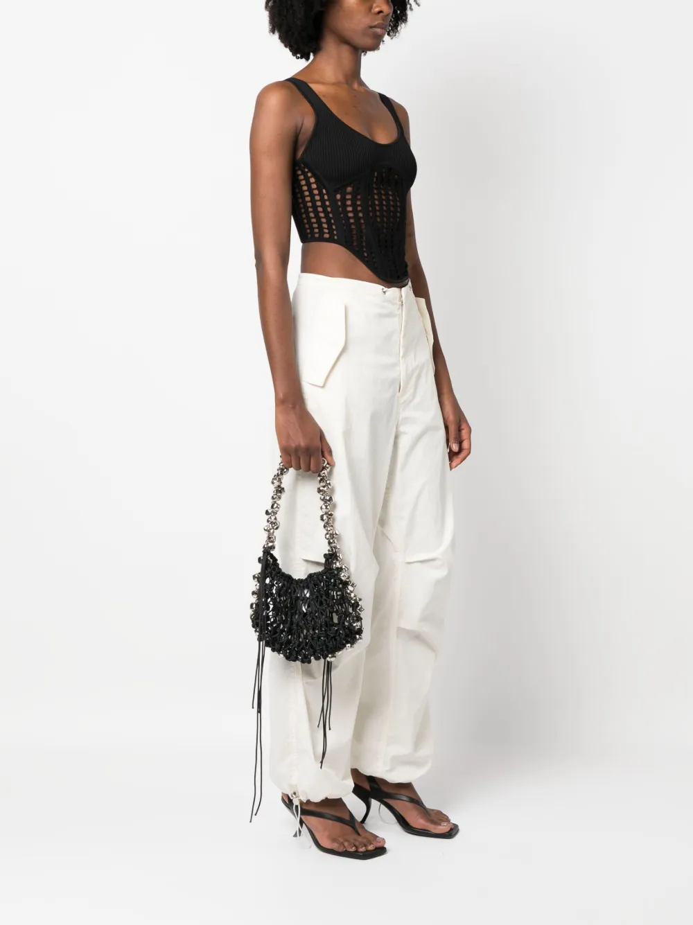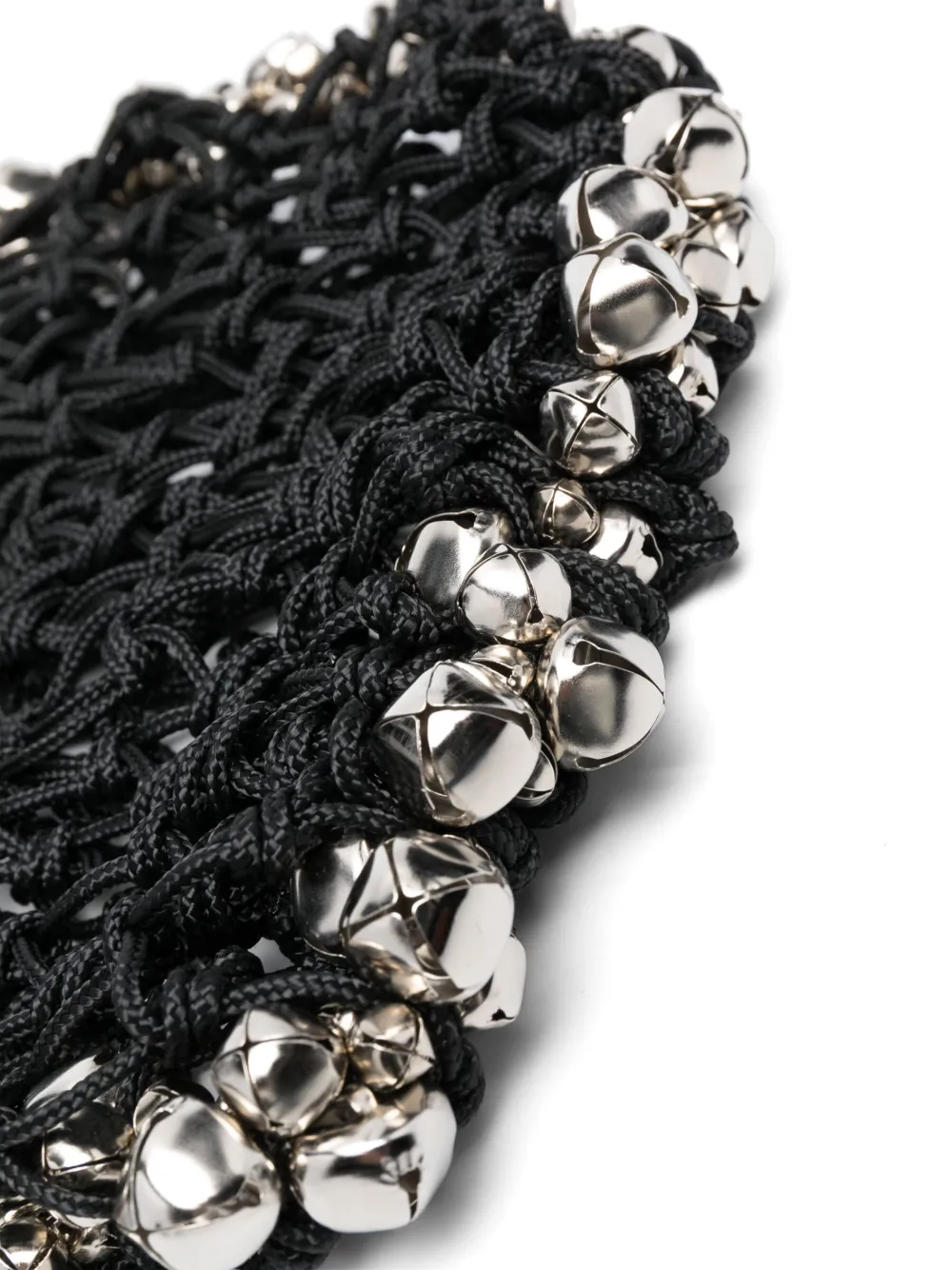 Черный, переплетенный дизайн, серебристый, подвеска в виде колокольчика, драпировка, внутренняя бирка с логотипом, дизайн с открытым верхом, ручка из бусин и основное отделение