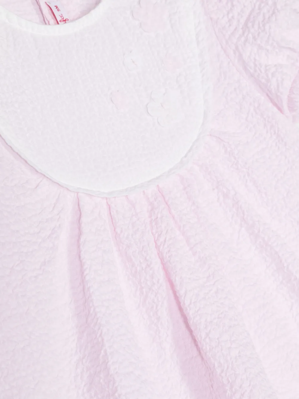 Пудрово-розовый, эластичный хлопок, цветочная деталь, круглый вырез, короткие рукава, застежка на пуговицы сзади и эластичный подол