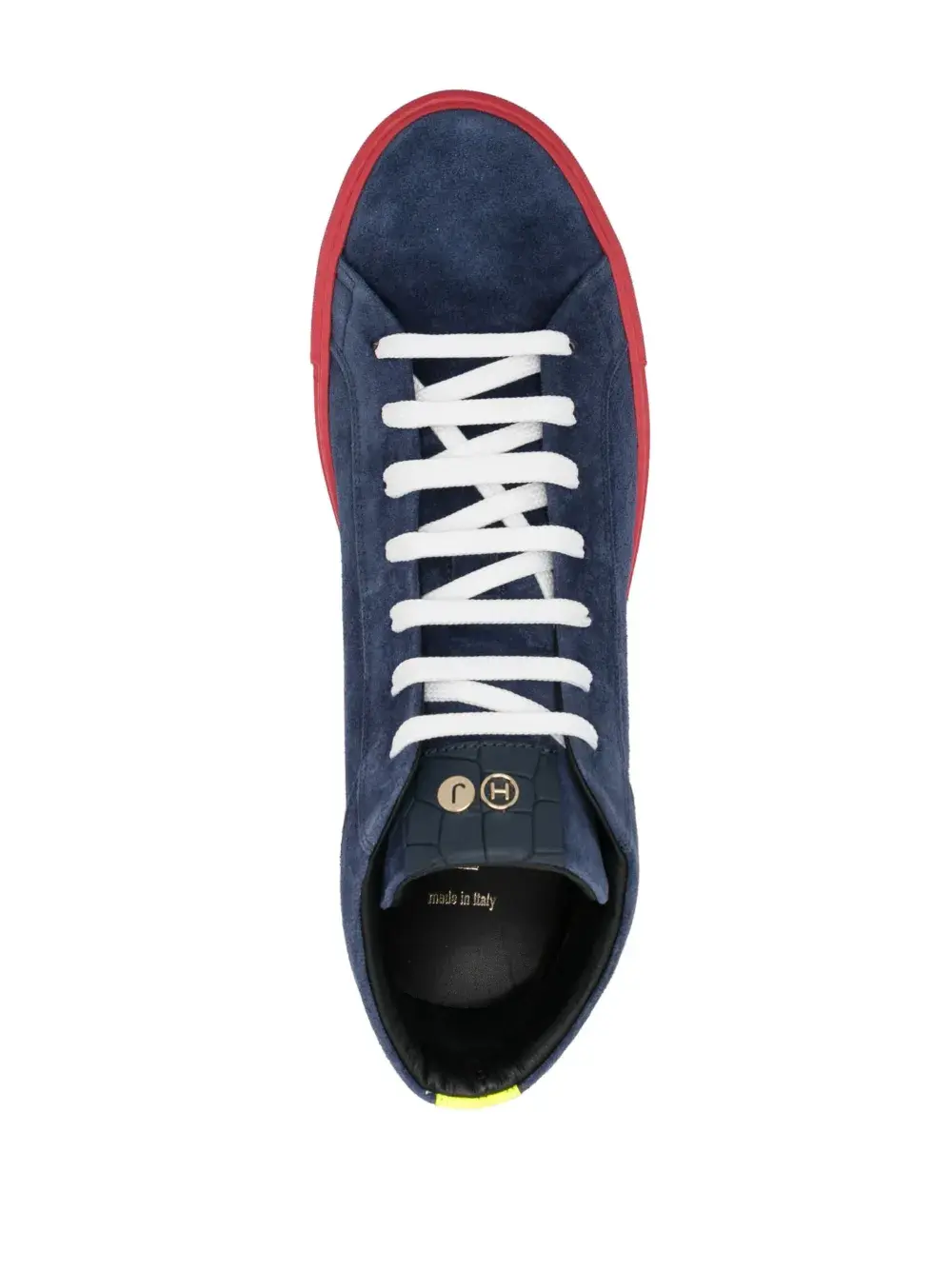 Темно-синий, ярко-красный, телячья кожа, металлический логотип на язычке, закругленный носок, шнуровка спереди, контрастный задник, логотип на подошве и резиновая подошва.