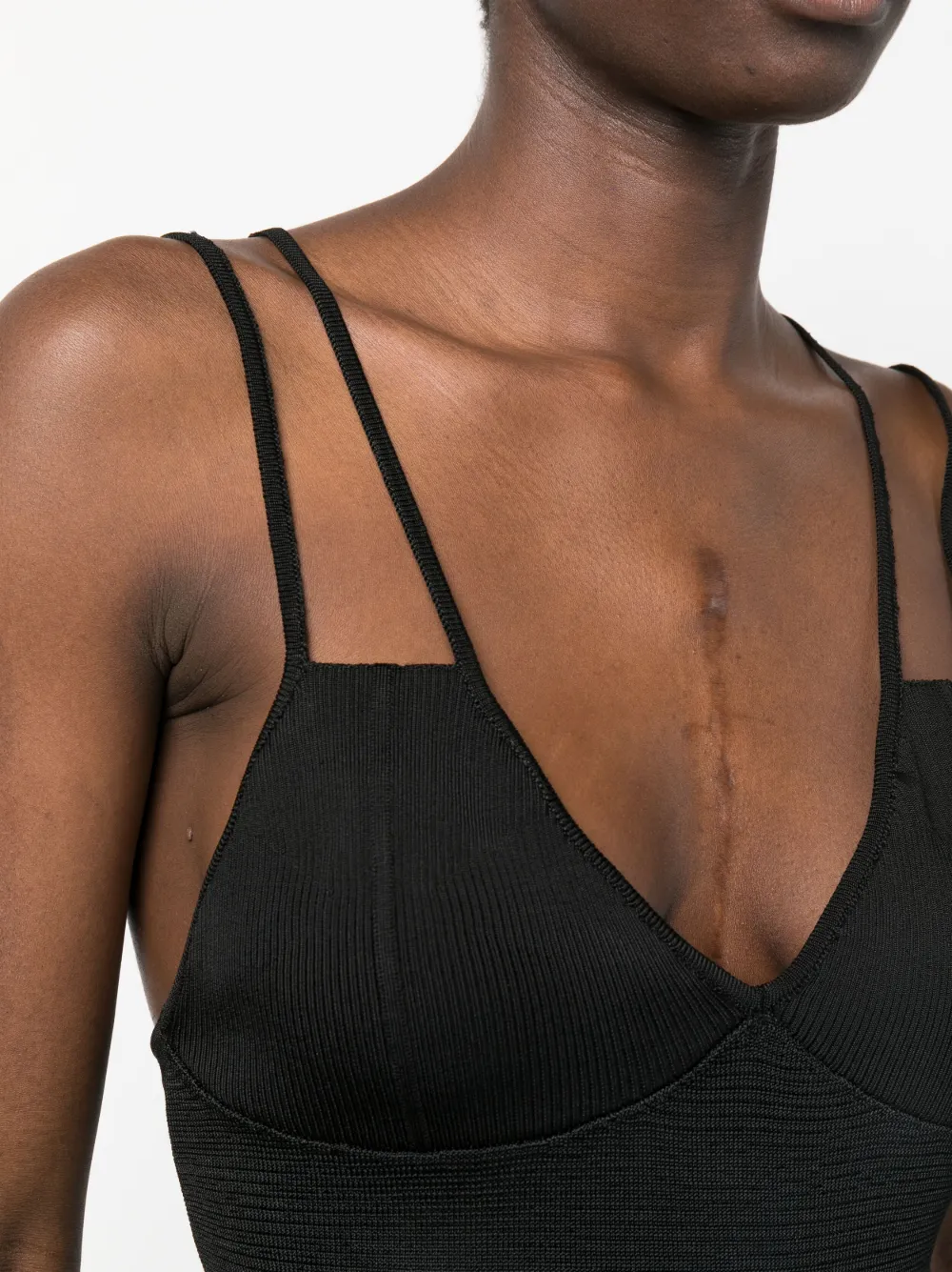 Подробнее о товаре: Трикотажный материал, узкие бретели, V-образный вырез, приталенный силуэт и длина до бедер.