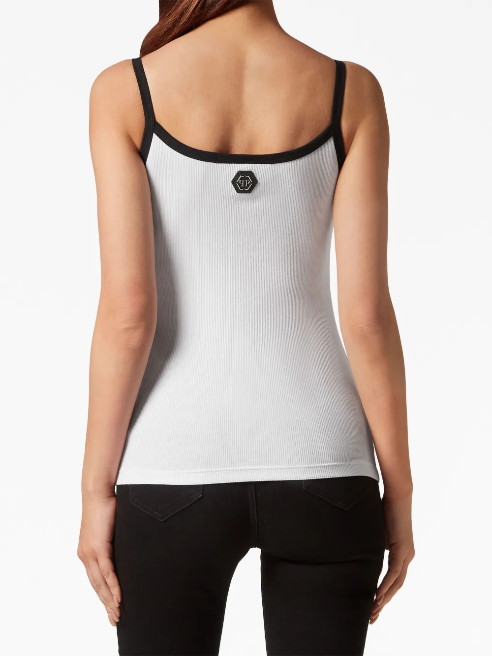 Белый, хлопок, принт с изображением черепа, глубокий U-образный вырез, нашивка с логотипом сзади, контрастные края, без рукавов и прямой подол