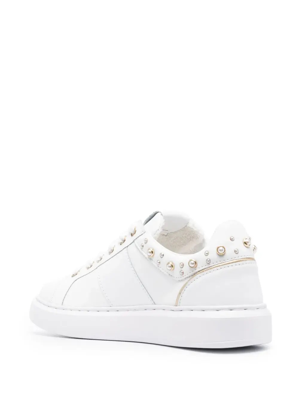 Белый, золотистый, телячья кожа, искусственный жемчуг, логотип сбоку, нашивка с логотипом на язычке, закругленный носок, шнуровка спереди, стелька с логотипом и плоская резиновая подошва