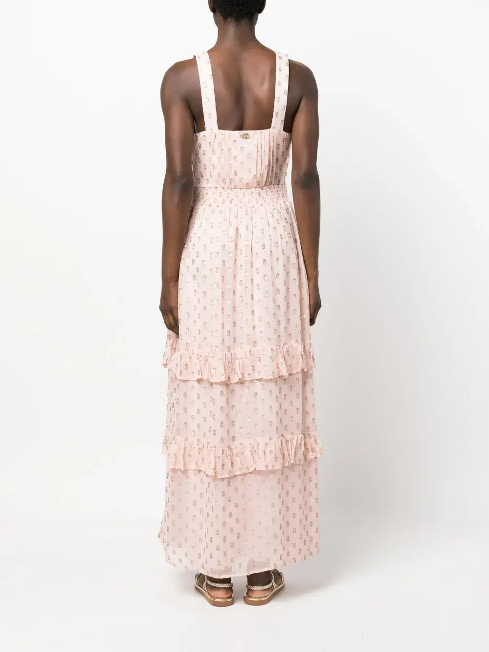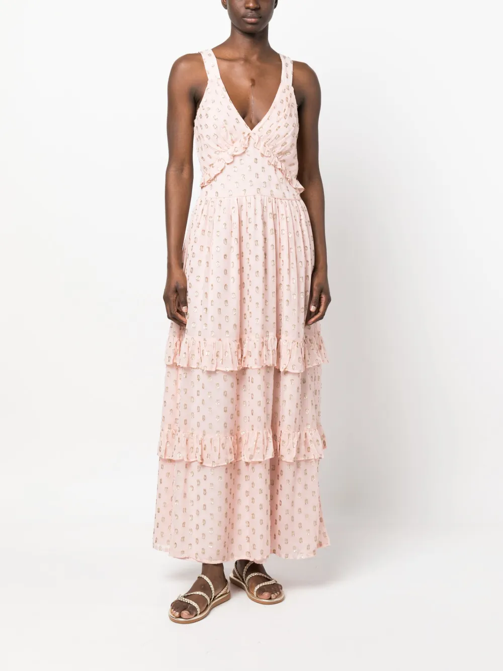 Светло-розовый, вставки с оборками, дизайн со сборками, глубокий V-образный вырез, без рукавов, эластичный пояс и высота по щиколотку