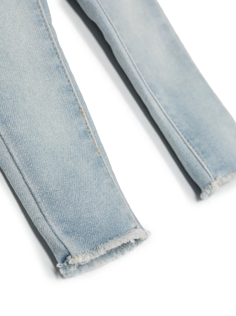 Синий, смесовый хлопок, деним, эластичный материал, нашивка с логотипом сзади, петли для ремня, прямой крой, средняя посадка, пять карманов и необработанные края