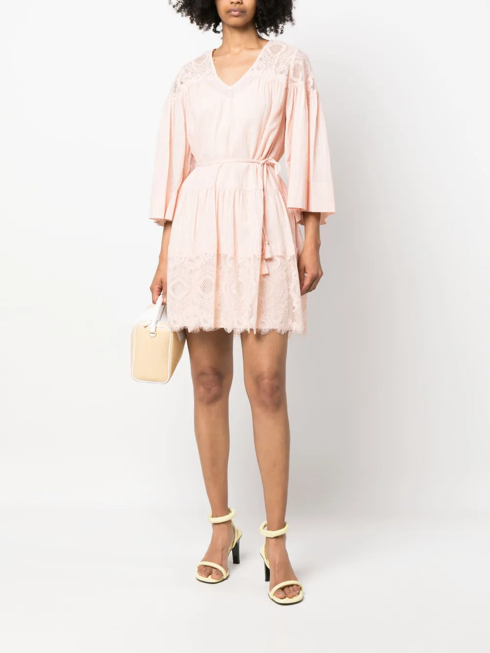 Персиково-розовый, хлопок, кружевные вставки, V-образный вырез, рукава три четверти, кулиска на талии, расклешенная юбка и длина выше колена