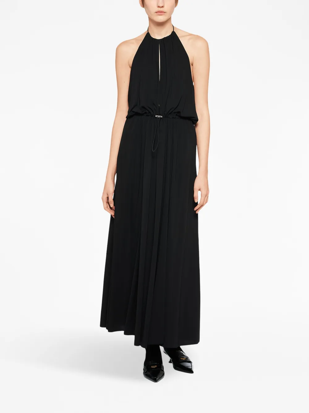 Черный, вырез-петля халтер, без рукавов, кулиска на талии, прямой подол и длинная модель
