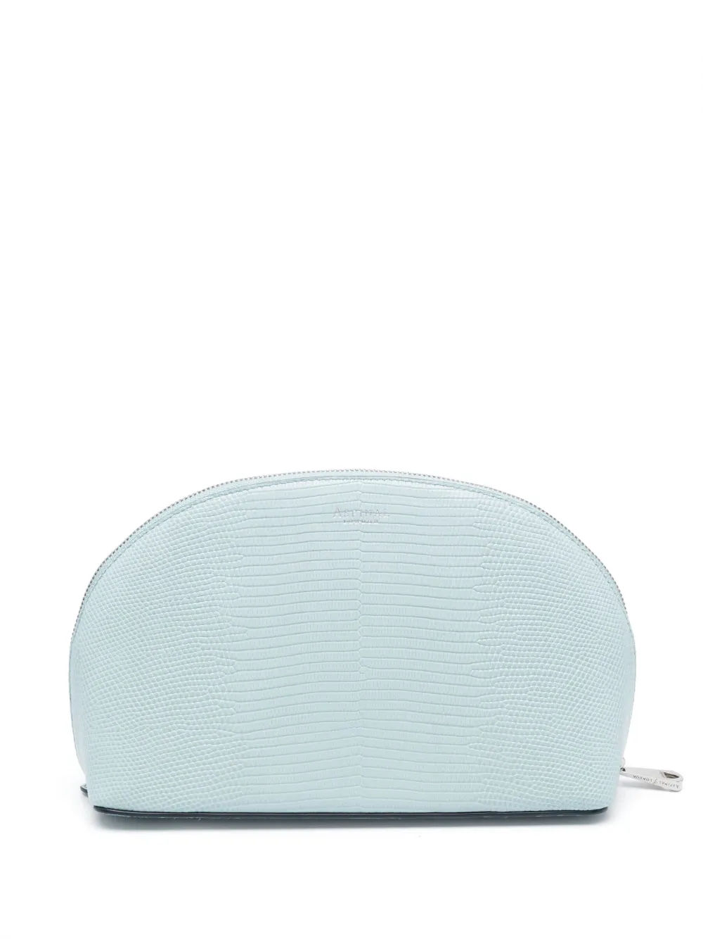 Голубой, телячья кожа, тиснение под кожу рептилии, нашивка с логотипом спереди, серебристая фурнитура, закругленная форма, водонепроницаемая модель, застежка на молнии сверху и основное отделение