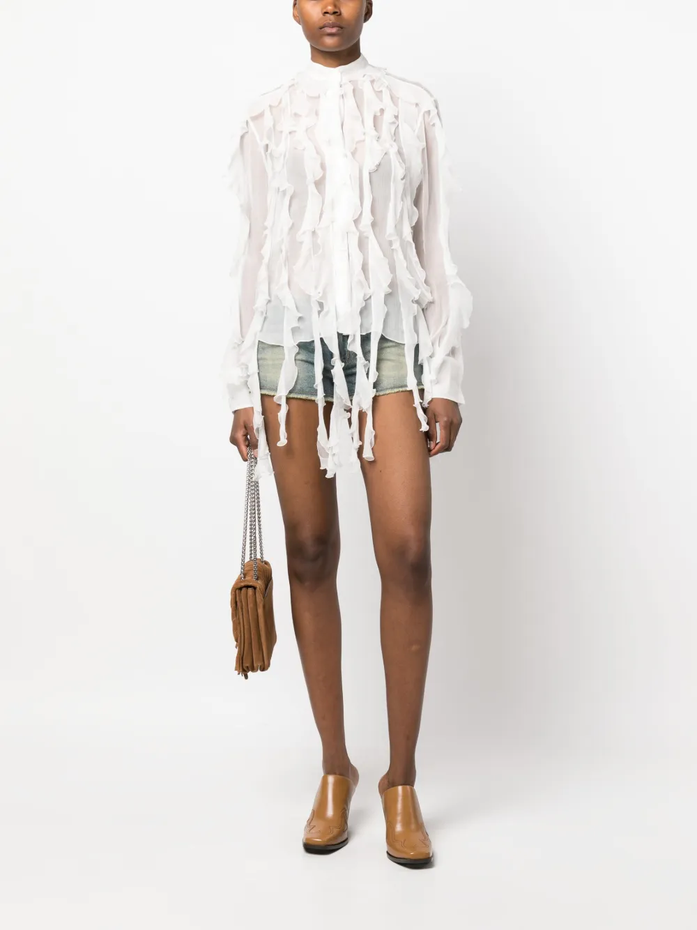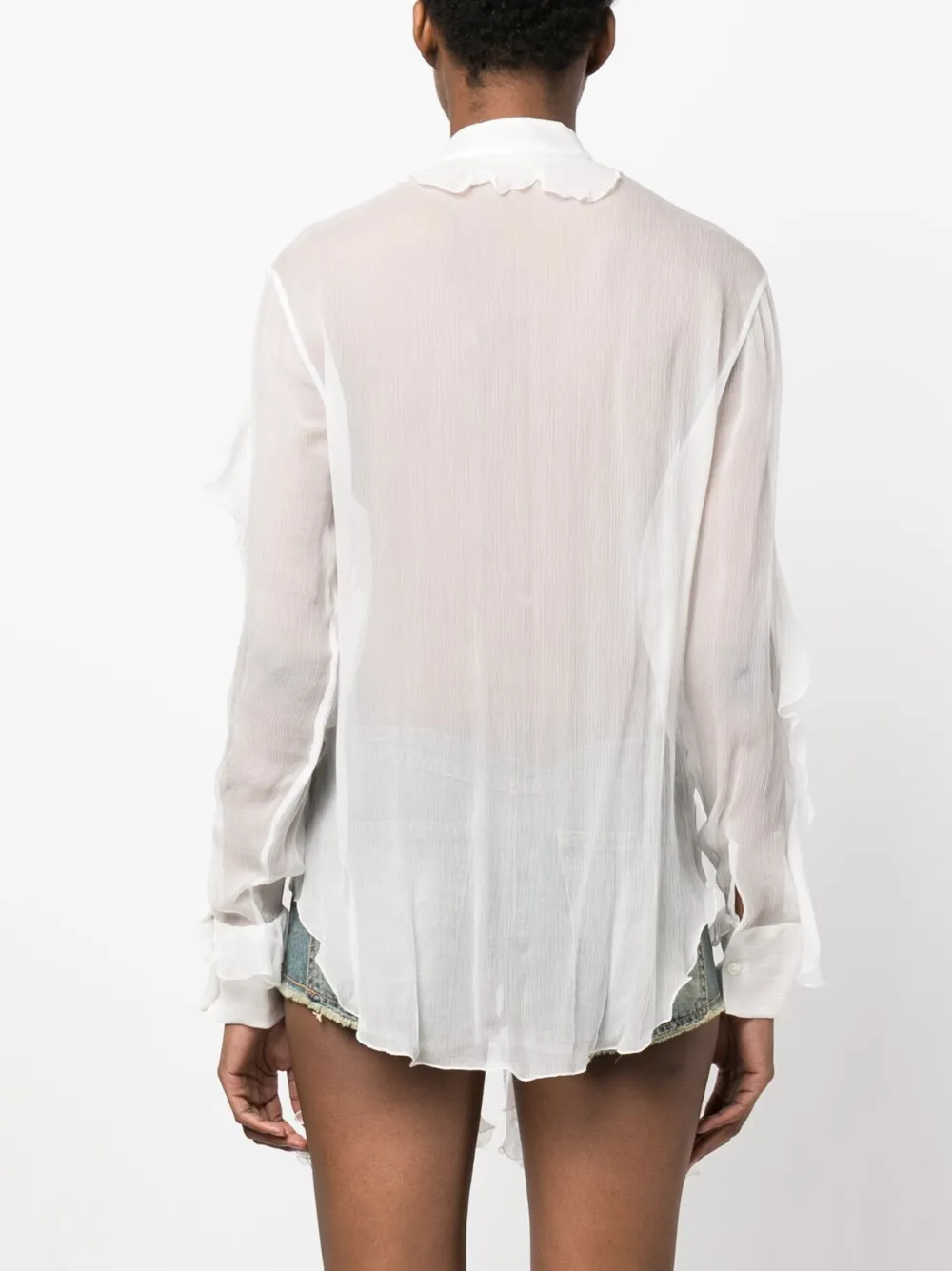 Белый, шелк, прозрачное покрытие, многослойный эффект, вставки с оборками, воротник-стойка, потайная пуговичная застежка спереди, длинные рукава, манжеты на пуговицах и закругленный подол сзади