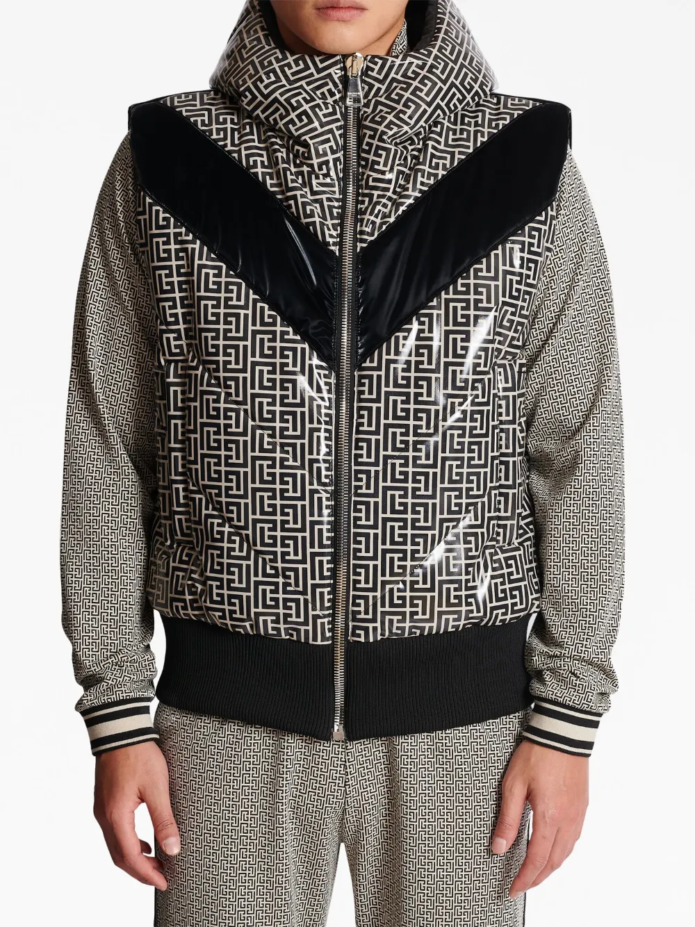 Черный/белый, дутый материал, принт с монограммой PB, классический капюшон, застежка на молнии спереди, без рукавов, два прорезных кармана по бокам и подол в рубчик