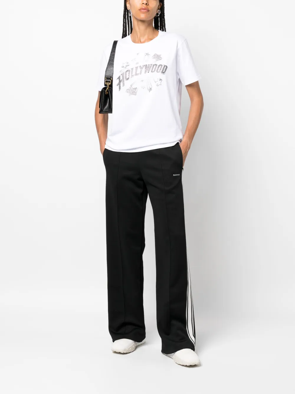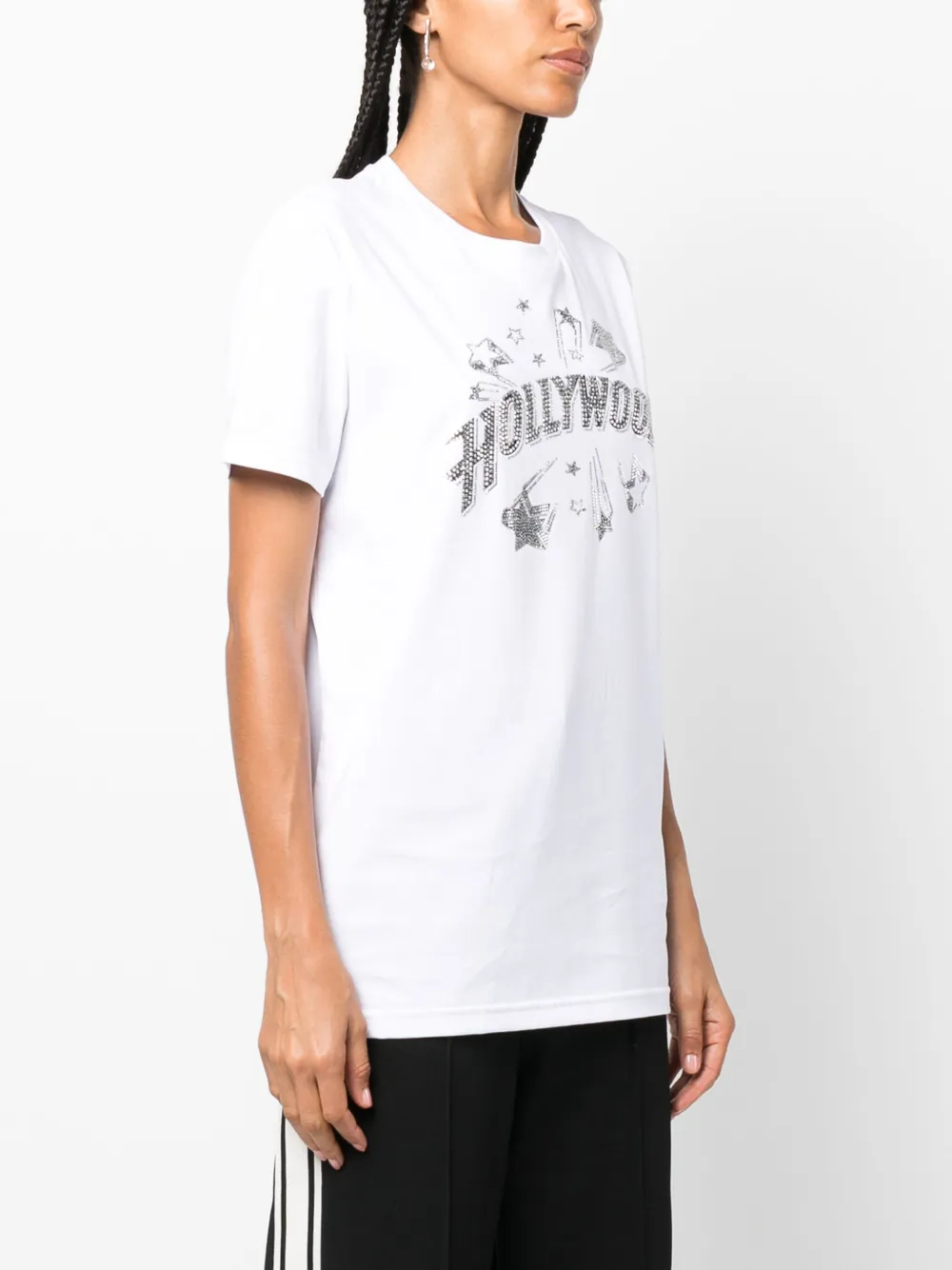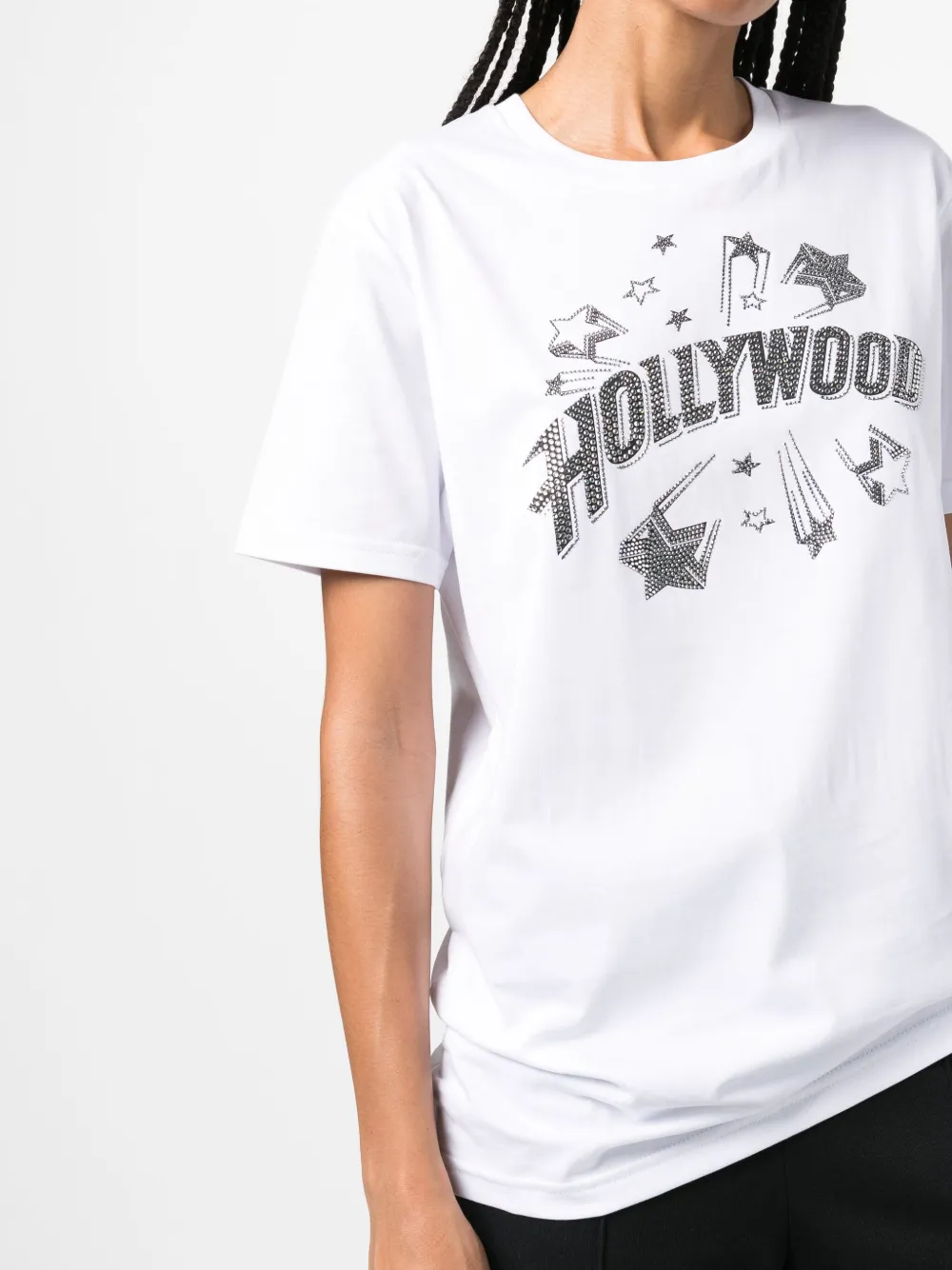 Белый/черный, хлопок, принт с надписью спереди, украшения из горного хрусталя, круглый вырез, короткие рукава и прямой подол