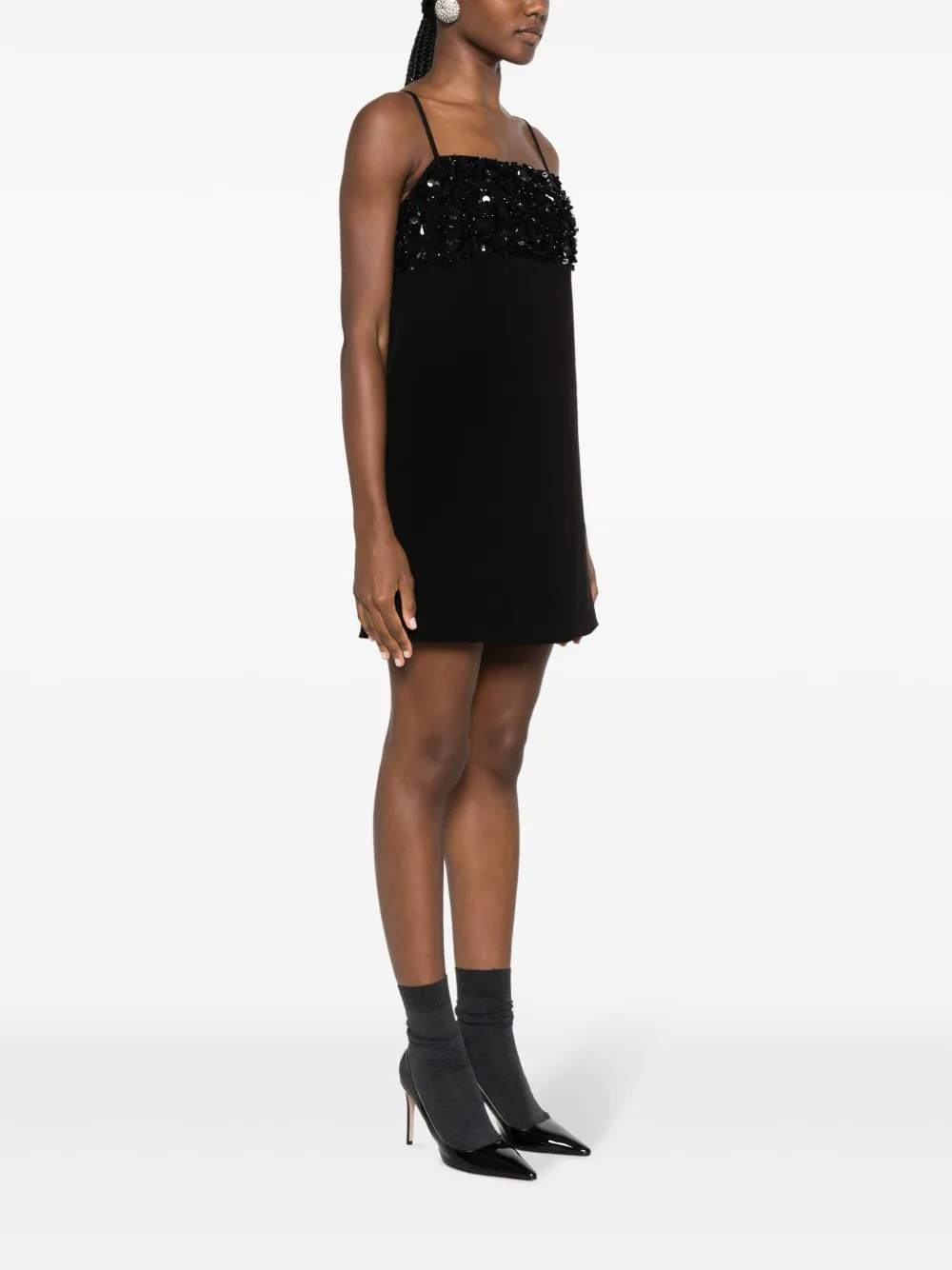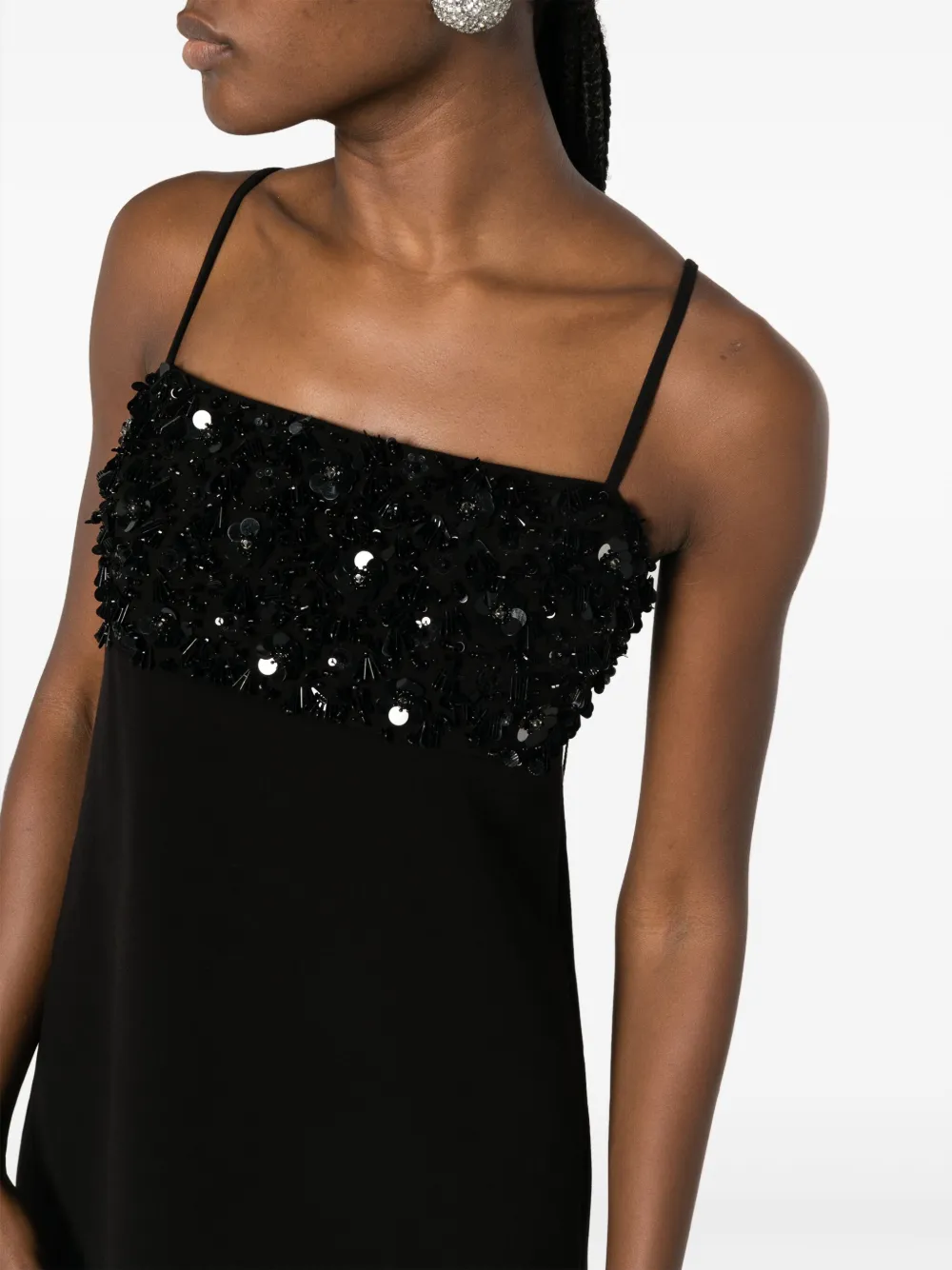 Черный, украшение из пайеток, цветочная деталь, квадратный вырез, потайная застежка на молнии сзади, тонкие бретели и длина до бедер