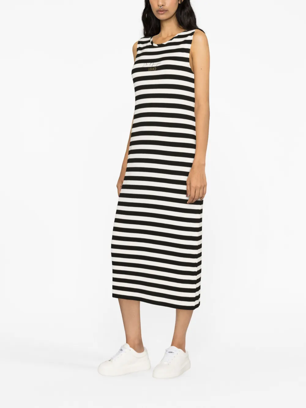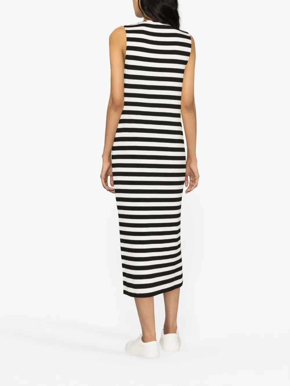 Черный/белый, эластичный материал, узор в горизонтальную полоску, принт с надписью спереди, логотип спереди, круглый вырез, без рукавов и длина до середины икры