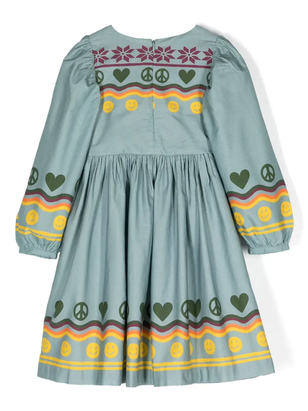 Голубой, хлопок, сплошной графичный принт, дизайн со сборками, круглый вырез, объемные рукава, потайная застежка сзади и расклешенный подол.