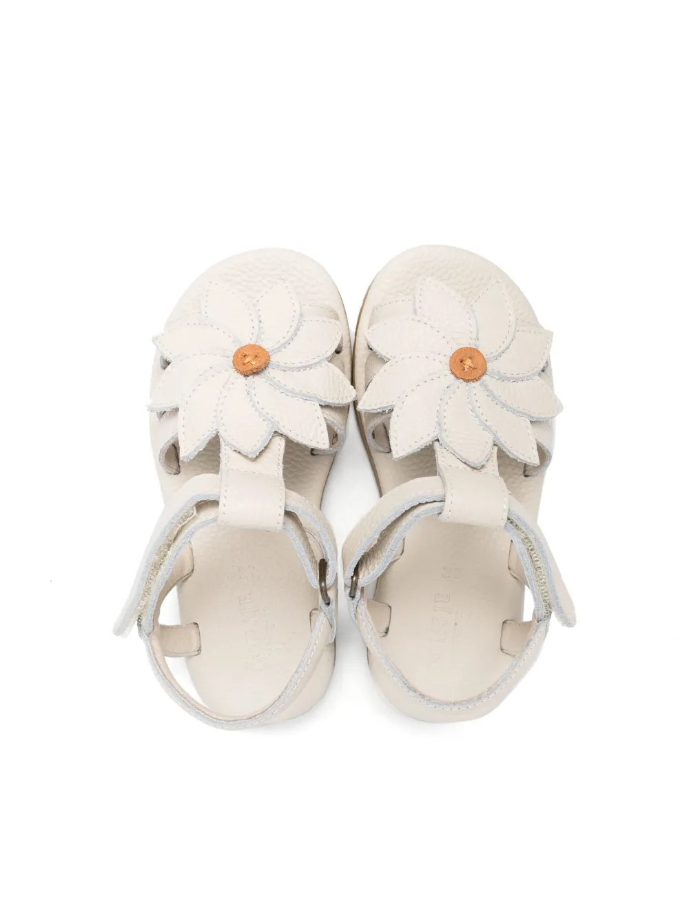 Цвет слоновой кости, телячья кожа, гладкая текстура кожи, цветочная аппликация, стелька с логотипом, открытый носок, закругленный носок, застежка на липучке и плоская резиновая подошва