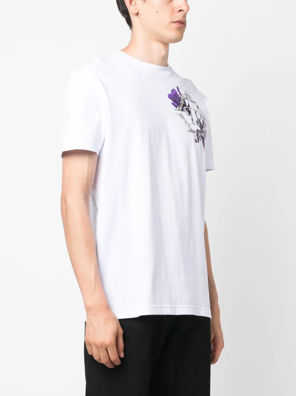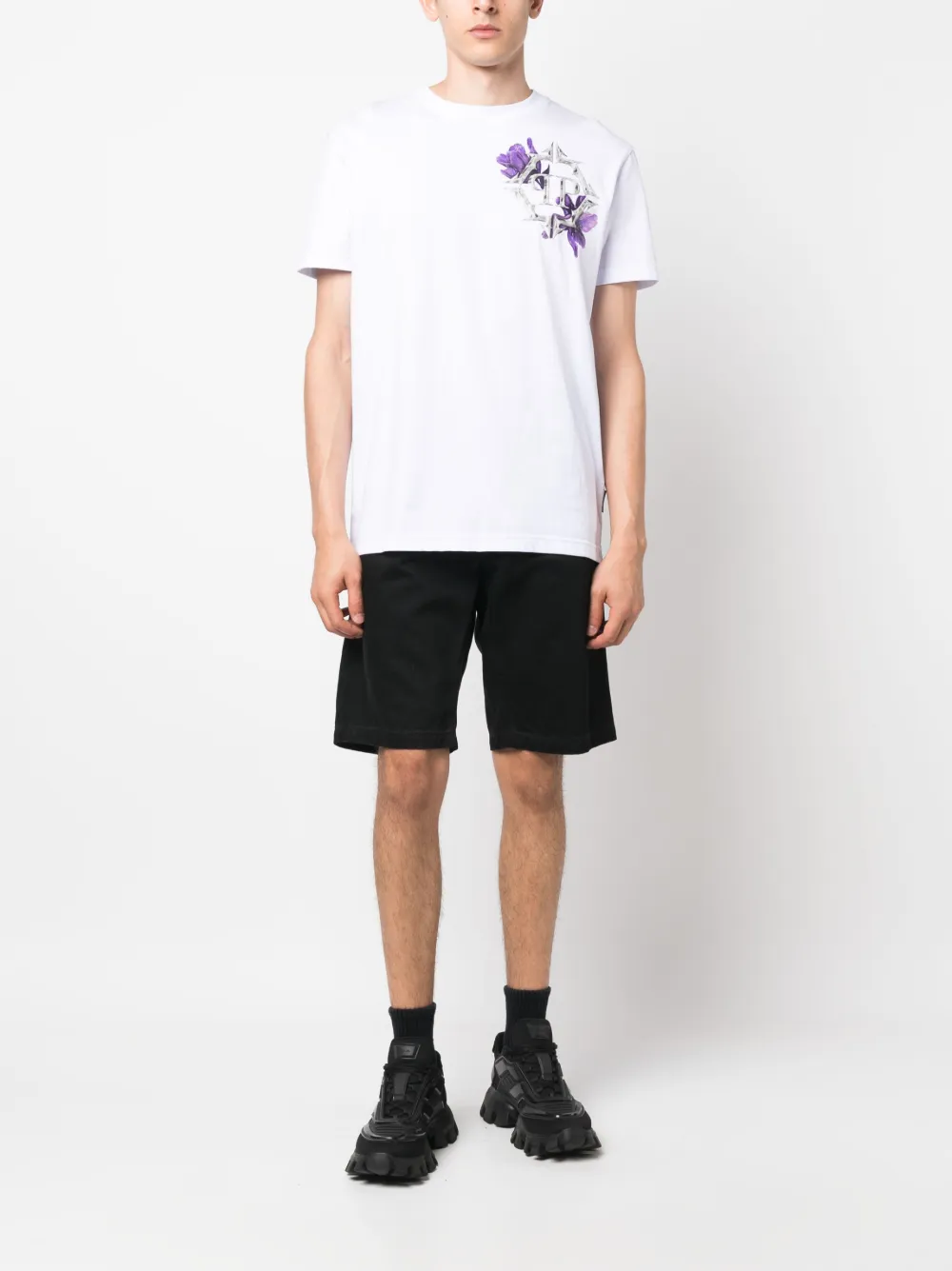 Белый/разноцветный, хлопок, принт с логотипом на груди, металлический логотип, цветочный принт, круглый вырез, короткие рукава и прямой подол