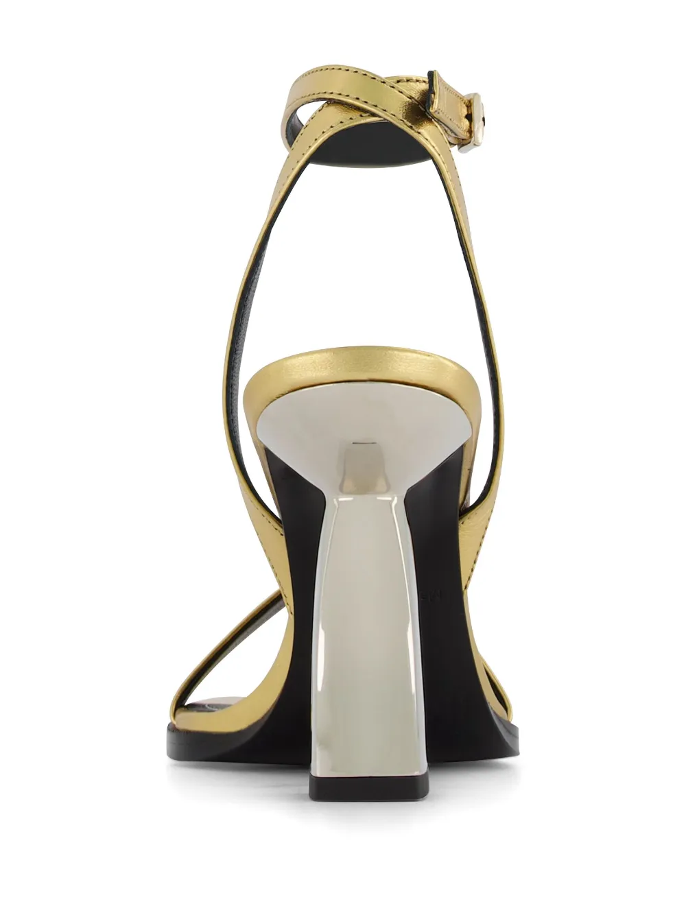 Золотистый, серебристый, кожа, золотистая фурнитура, квадратный открытый носок, ремешок на палец, ремешок на щиколотке с пряжкой, логотип на стельке и высокий скульптурный каблук