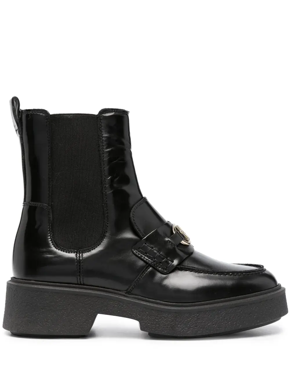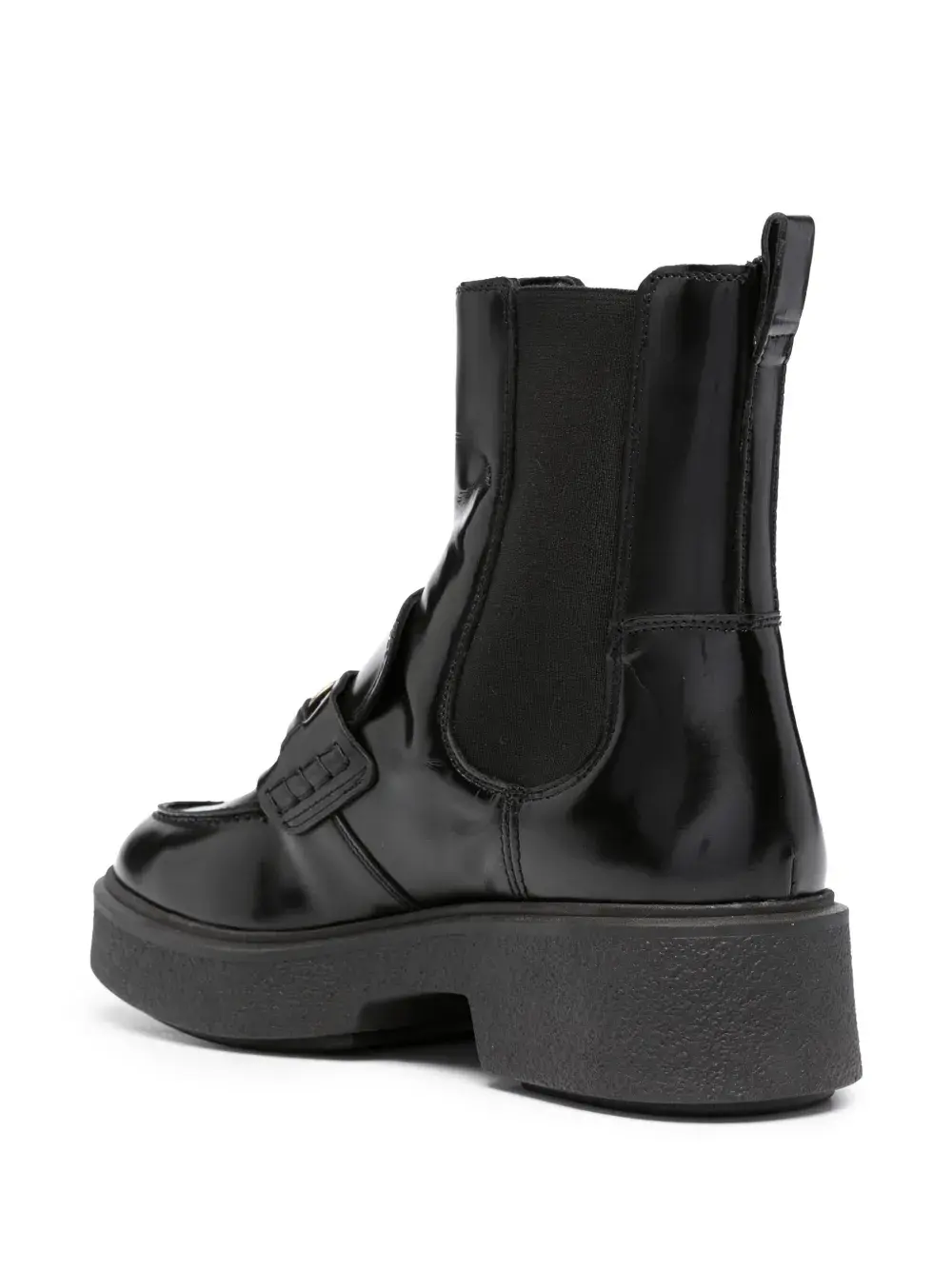 Черный, телячья кожа, глянцевая фактура, строчка в тон, металлический логотип, эластичные боковые вставки, петля для подтягивания сзади, закругленный носок, модель без застежки, стелька с логотипом, блочный каблук и резиновая подошва