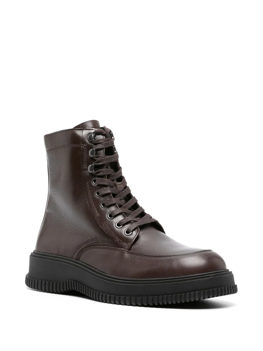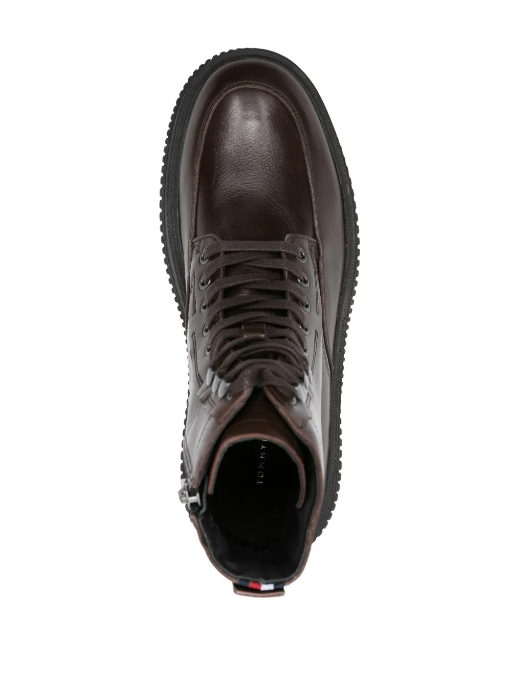 Шоколадный, телячья кожа, логотип на подошве, закругленный носок, шнуровка спереди, застежка на молнии сбоку, стелька с логотипом, петля для подтягивания сзади и массивная резиновая подошва