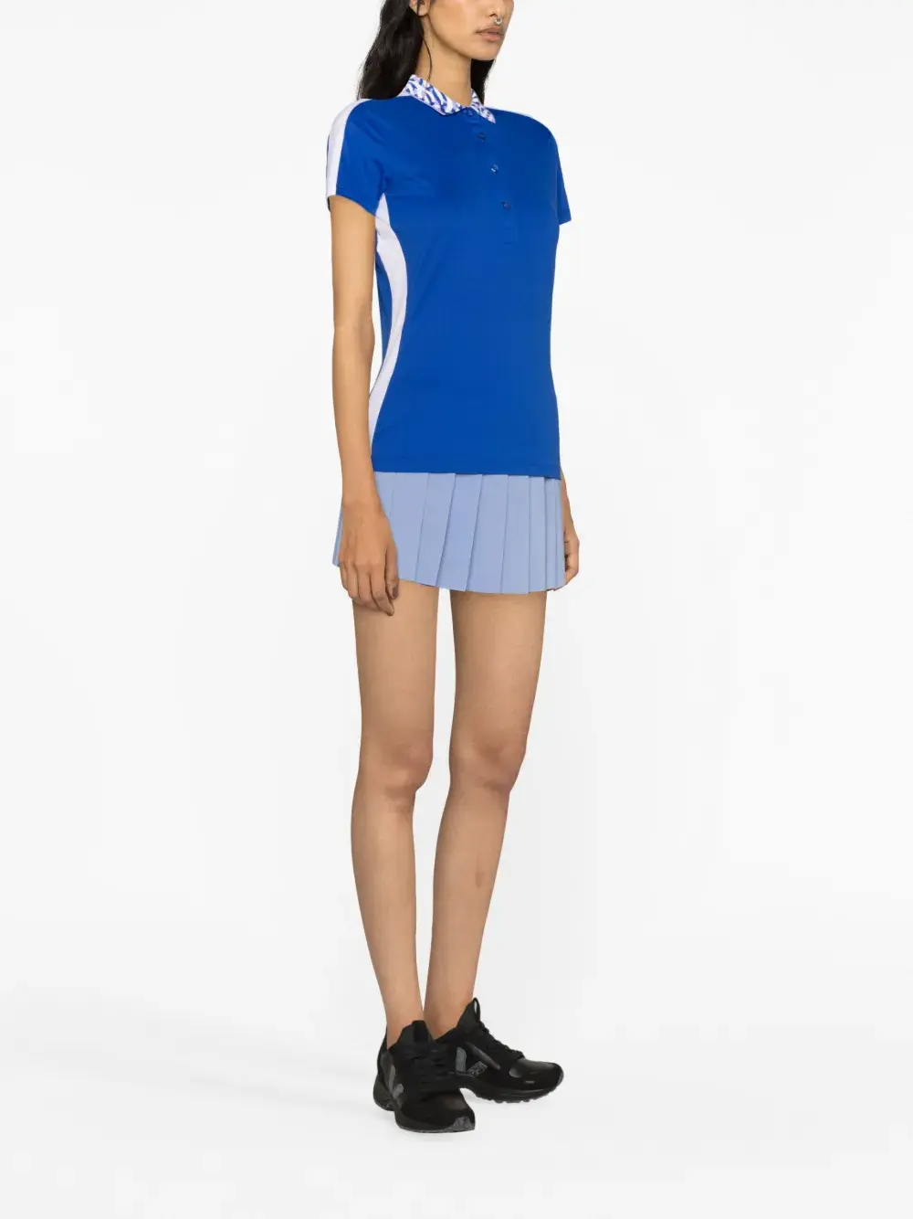 Расцветка Ocean Blue, эластичный материал, воротник поло, планка на пуговицах спереди, короткие рукава, прямой подол и полоска сбоку