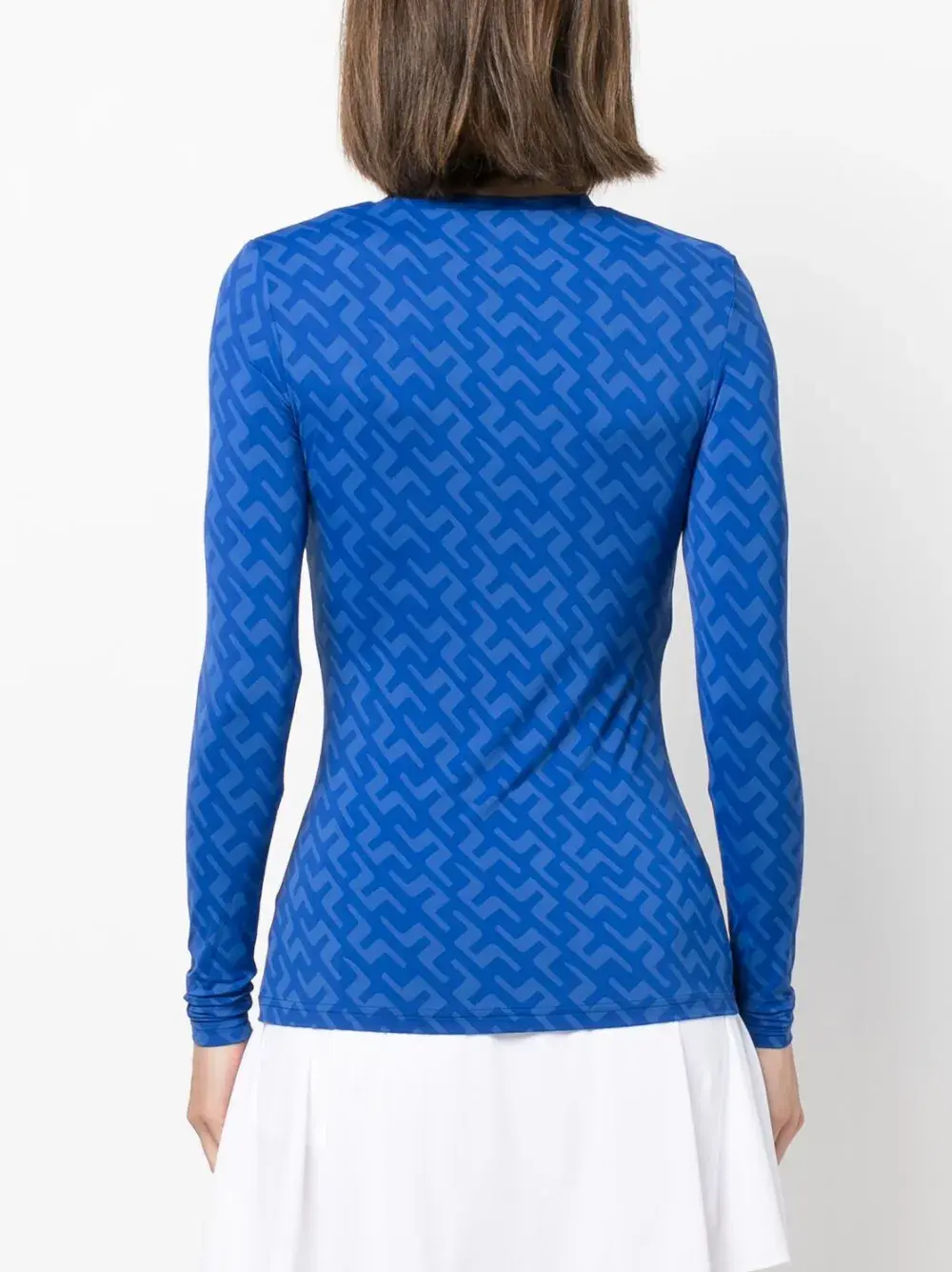 Синий, белый, эластичный материал, сплошной принт с логотипом, логотип спереди, текстовый принт, круглый вырез, длинные рукава и прямой подол